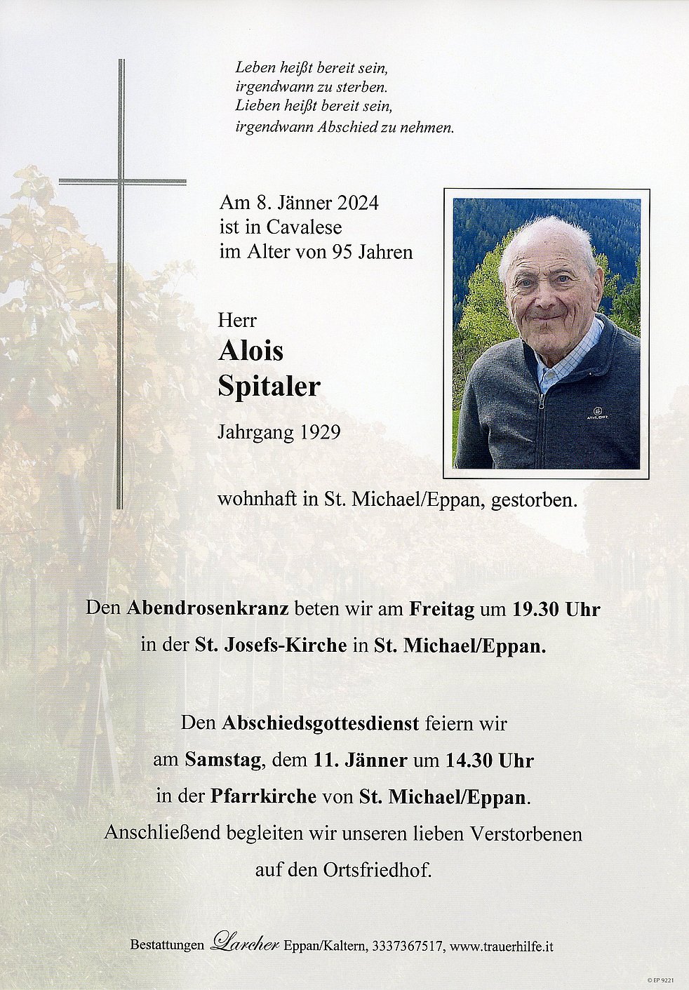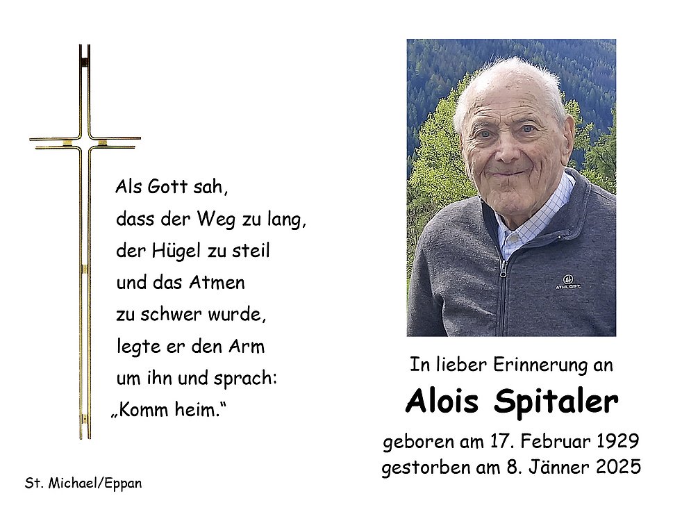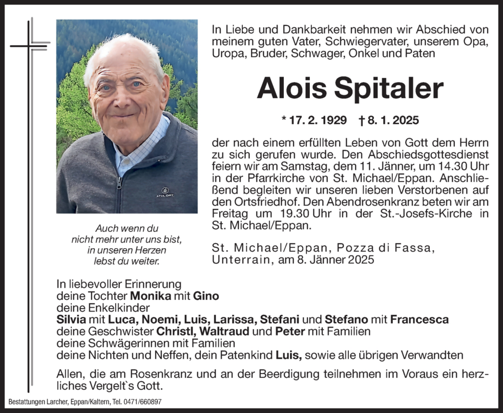 Den Abschiedsgottesdienst feiern wir am Samstag, dem 11. Jänner um 14.30 Uhr in der Pfarrkirche von St. Michael/Eppan. Anschließend begleiten wir unseren lieben Verstorbenen auf den Ortsfriedhof.