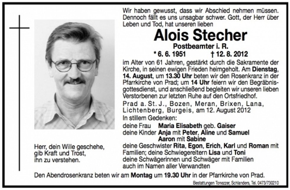 Am Dienstag, 14. August, um 13.30 Uhr beten wir den Rosenkranz in der Pfarrkirche von Prad; um 14 Uhr feiern wir den Begräbnisgottesdienst und anschließend begleiten wir unseren lieben Verstorbenen zur letzten Ruhe auf den Ortsfriedhof.