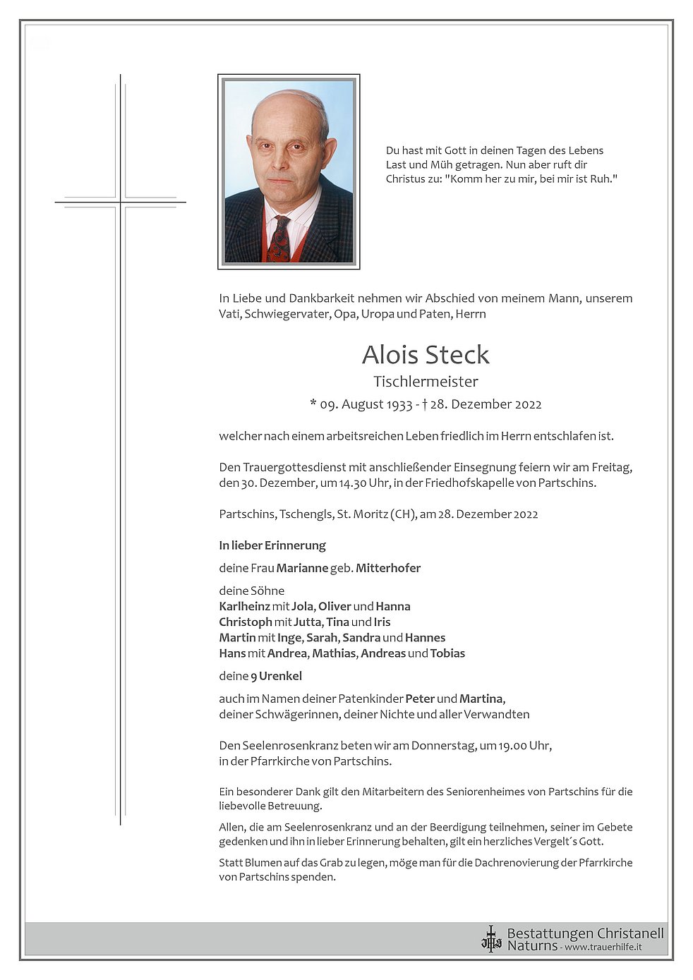 Den Trauergottesdienst mit anschließender Einsegnung feiern wir am Freitag, den 30. Dezember, um 14.30 Uhr, in der Friedhofskapelle von Partschins.