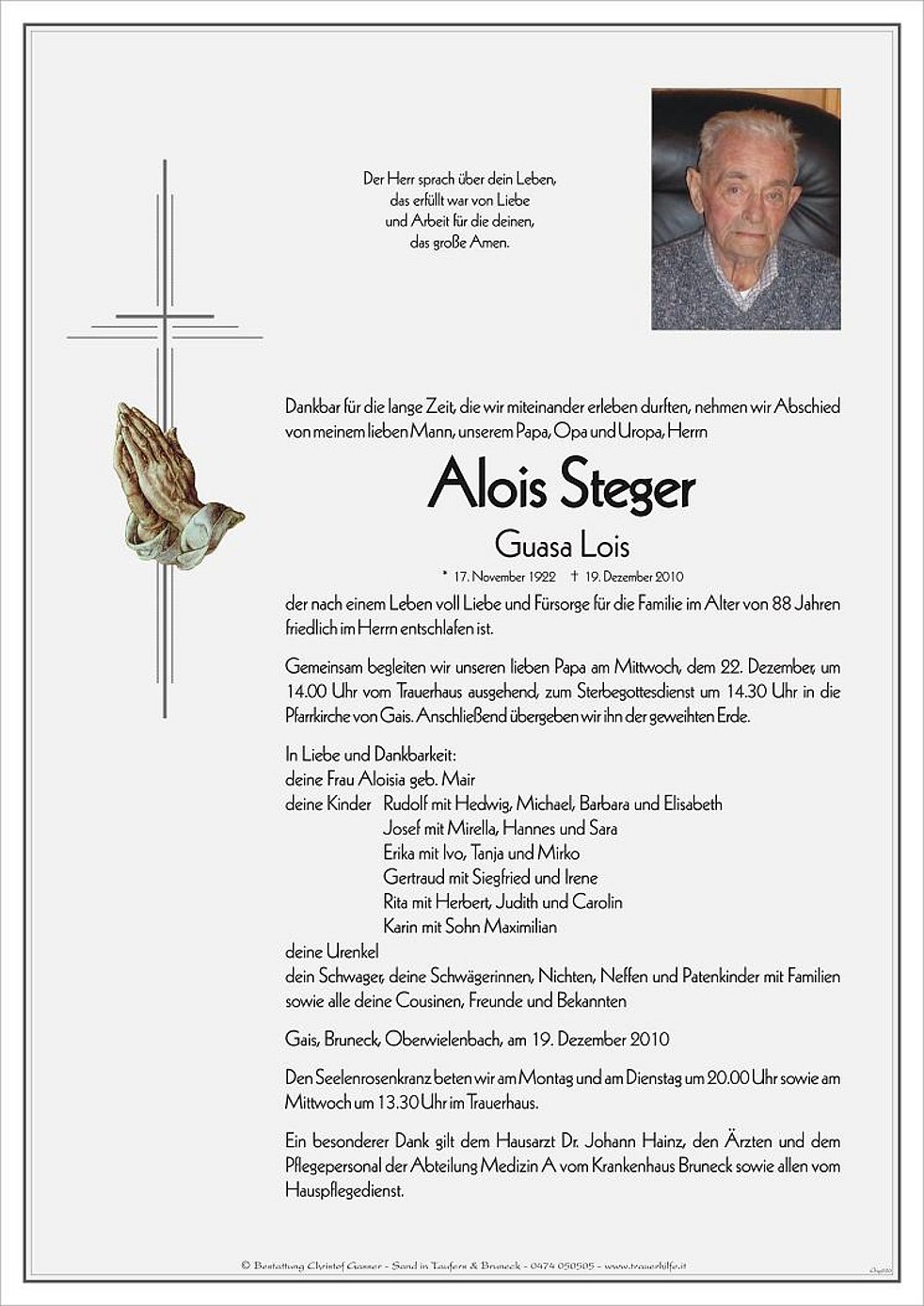 Gemeinsam begleiten wir unseren lieben Papa am Mittwoch, dem 22. Dezember, um 14.00 Uhr vom Trauerhaus ausgehend, zum Sterbegottesdienst um 14.30 Uhr in die Pfarrkirche von Gais. Anschließend übergeben wir ihn der geweihten Erde.