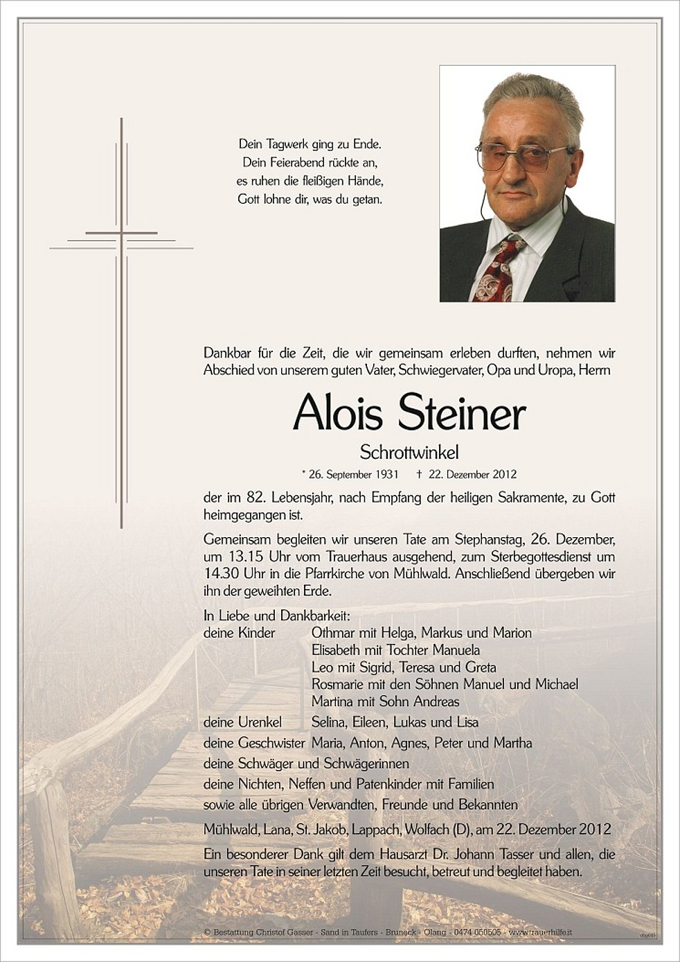 um 13.15 Uhr vom Trauerhaus ausgehend, zum Sterbegottesdienst um 14.30 Uhr in die Pfarrkirche von Mühlwald. Anschließend übergeben wir ihn der geweihten Erde.