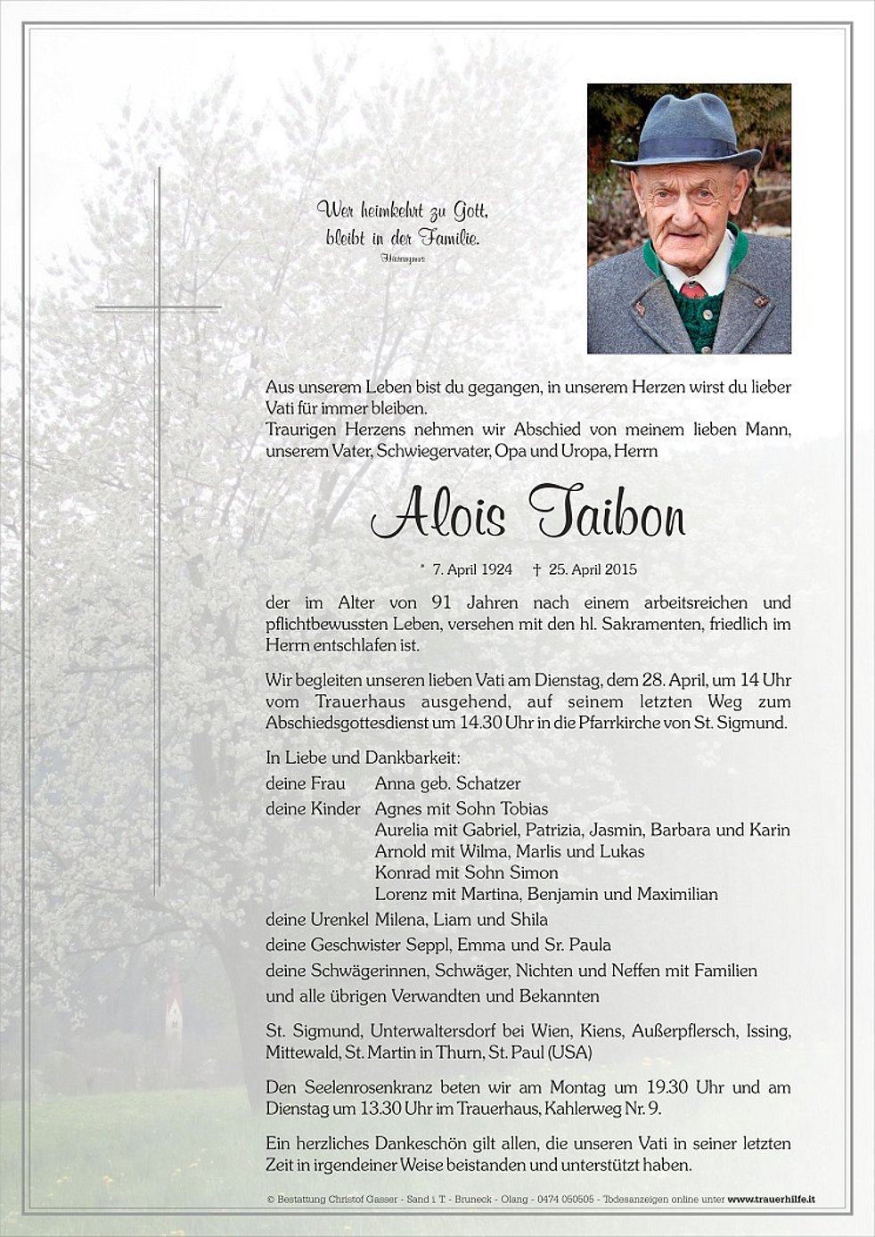 Wir begleiten unseren lieben Vati am Dienstag, dem 28. April, um 14 Uhr vom Trauerhaus ausgehend, auf seinem letzten Weg zum Abschiedsgottesdienst um 14.30 Uhr in die Pfarrkirche von St. Sigmund.
