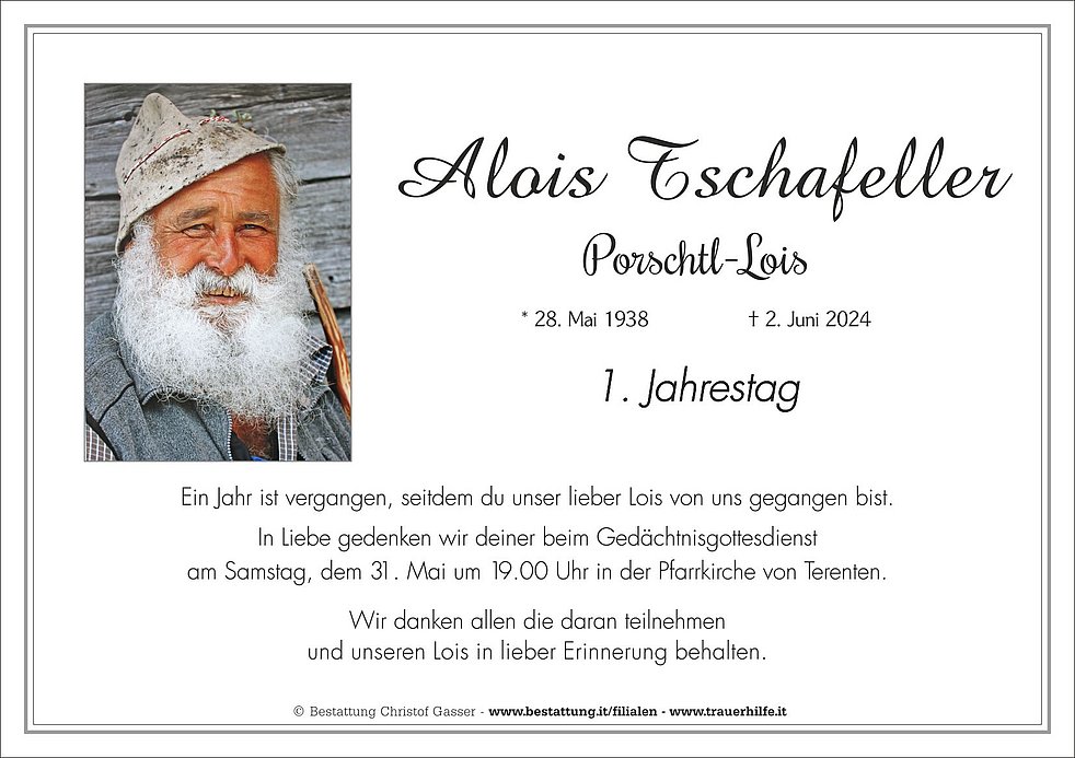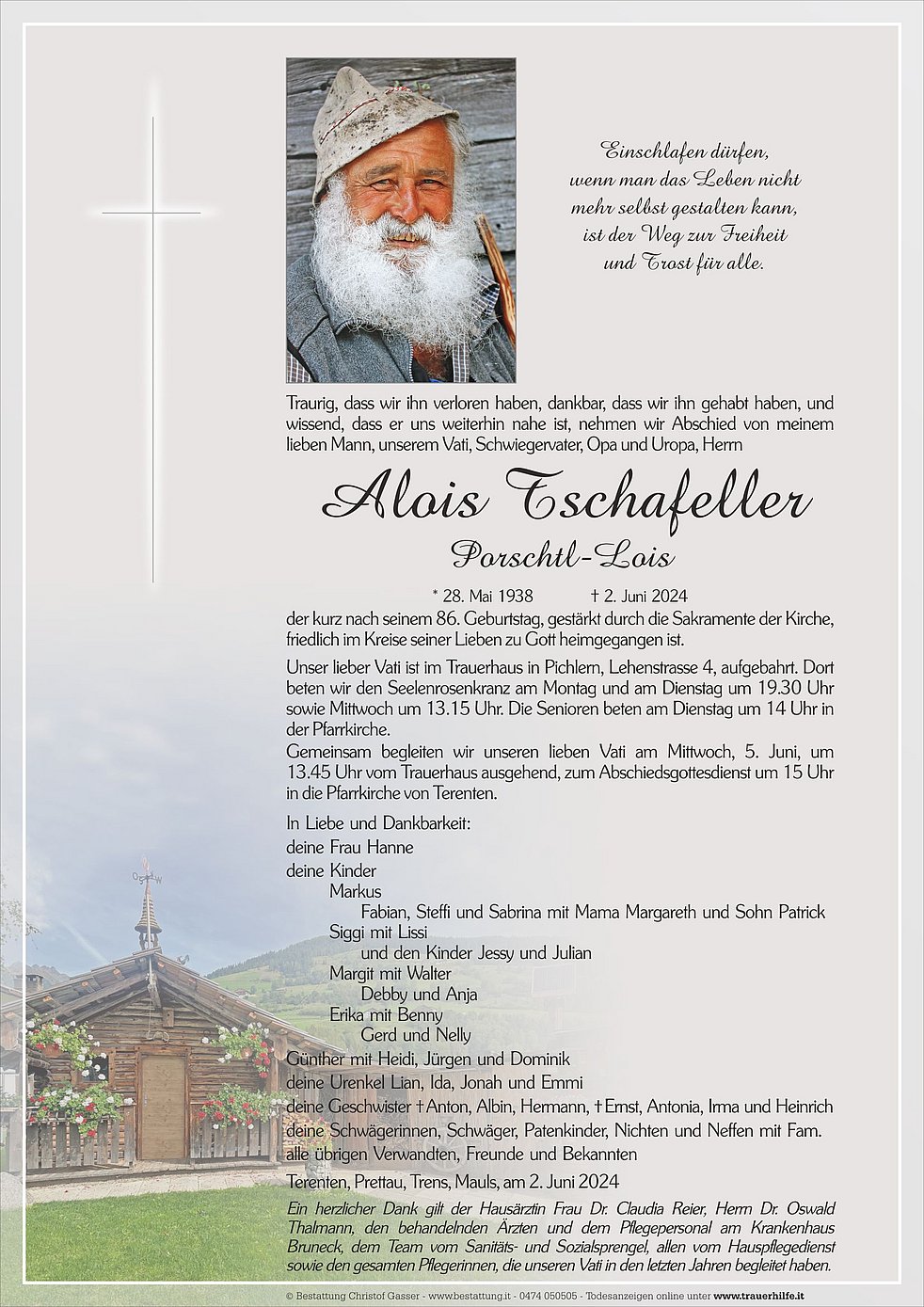 Ein herzlicher Dank gilt der Hausärztin Frau Dr. Claudia Reier, Herrn Dr. Oswald Thalmann, den behandelnden Ärzten und dem Pflegepersonal am Krankenhaus Bruneck, dem Team vom Sanitäts- und Sozialsprengel, allen vom Hauspflegedienst sowie den gesamten Pflegerinnen, die unseren Vati in den letzten Jahren begleitet haben.