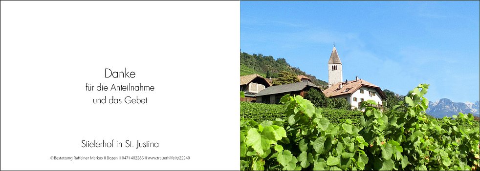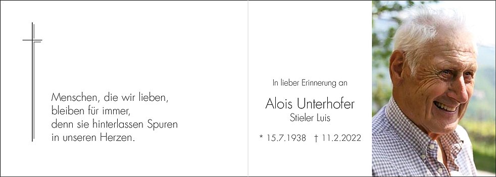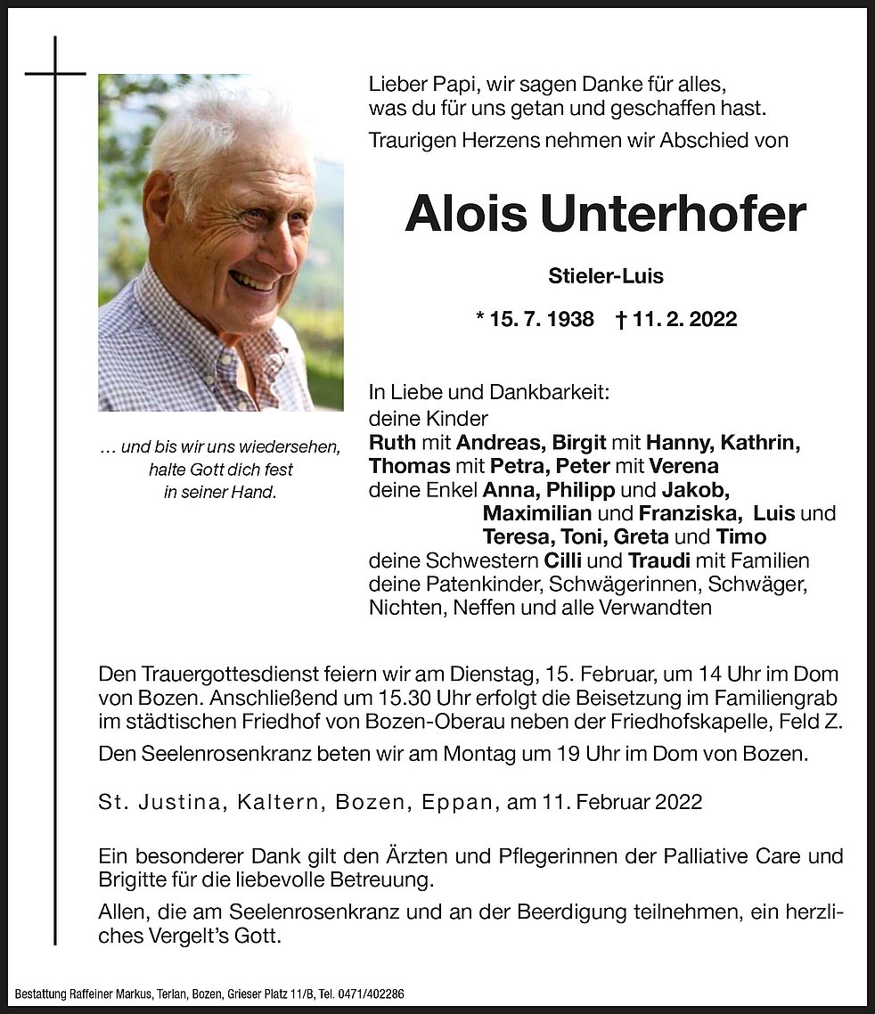 Den Trauergottesdienst feiern wir am Dienstag, 15. Februar, um 14 Uhr im Dom von Bozen. Anschließend um 15.30 Uhr erfolgt die Beisetzung im Familiengrab im städtischen Friedhof von Bozen-Oberau, neben der Friedhofskapelle, Feld Z.