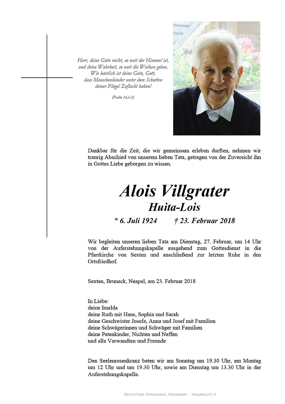 Wir begleiten unseren lieben Tata am Dienstag, 27. Februar, um 14 Uhr von der Auferstehungskapelle ausgehend zum Gottesdienst in die Pfarrkirche von Sexten und anschließend zur letzten Ruhe in den Ortsfriedhof.