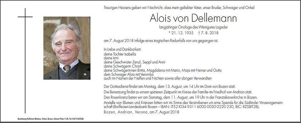 Die Beisetzung findet zu einem späteren Zeitpunkt im Kreise der Familie im Friedhof von Andrian statt.