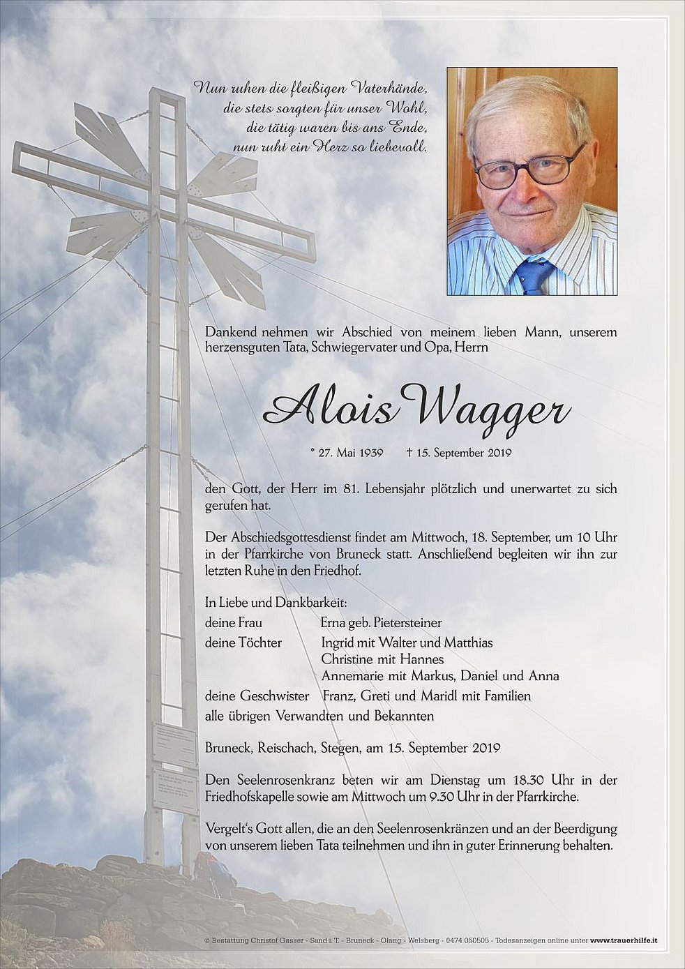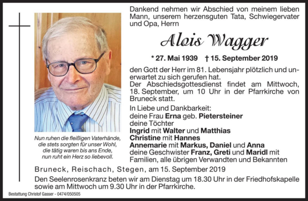 Der Abschiedsgottesdienst findet am Mittwoch, 18. September, um 10 Uhr in der Pfarrkirche von Bruneck statt. Anschließend begleiten wir ihn zur letzten Ruhe in den Friedhof.