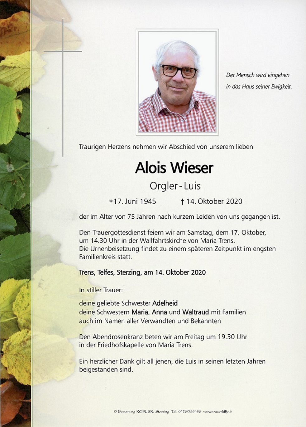 Den Trauergottesdienst feiern wir am Samstag, dem 17. Oktober, um 14.30 Uhr in der Wallfahrtskirche von Maria Trens. Die Urnenbeisetzung findet zu einem späteren Zeitpunkt im engsten Familienkreis statt.