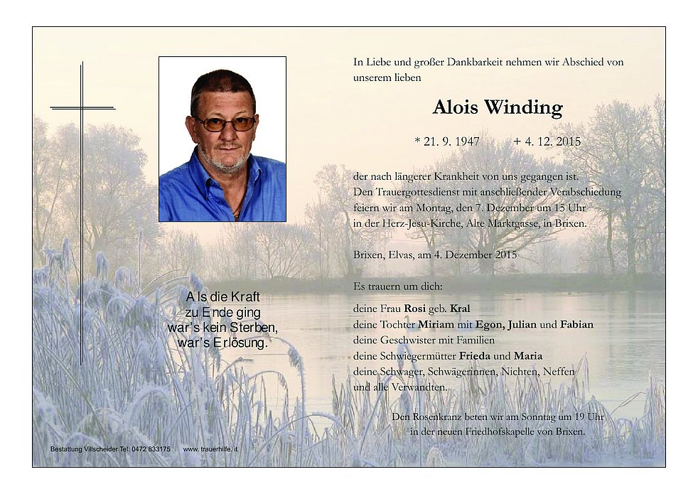 Den Trauergottesdienst mit anschließender Verabschiedung feiern wir am Montag, den 7. Dezember um 15 Uhr