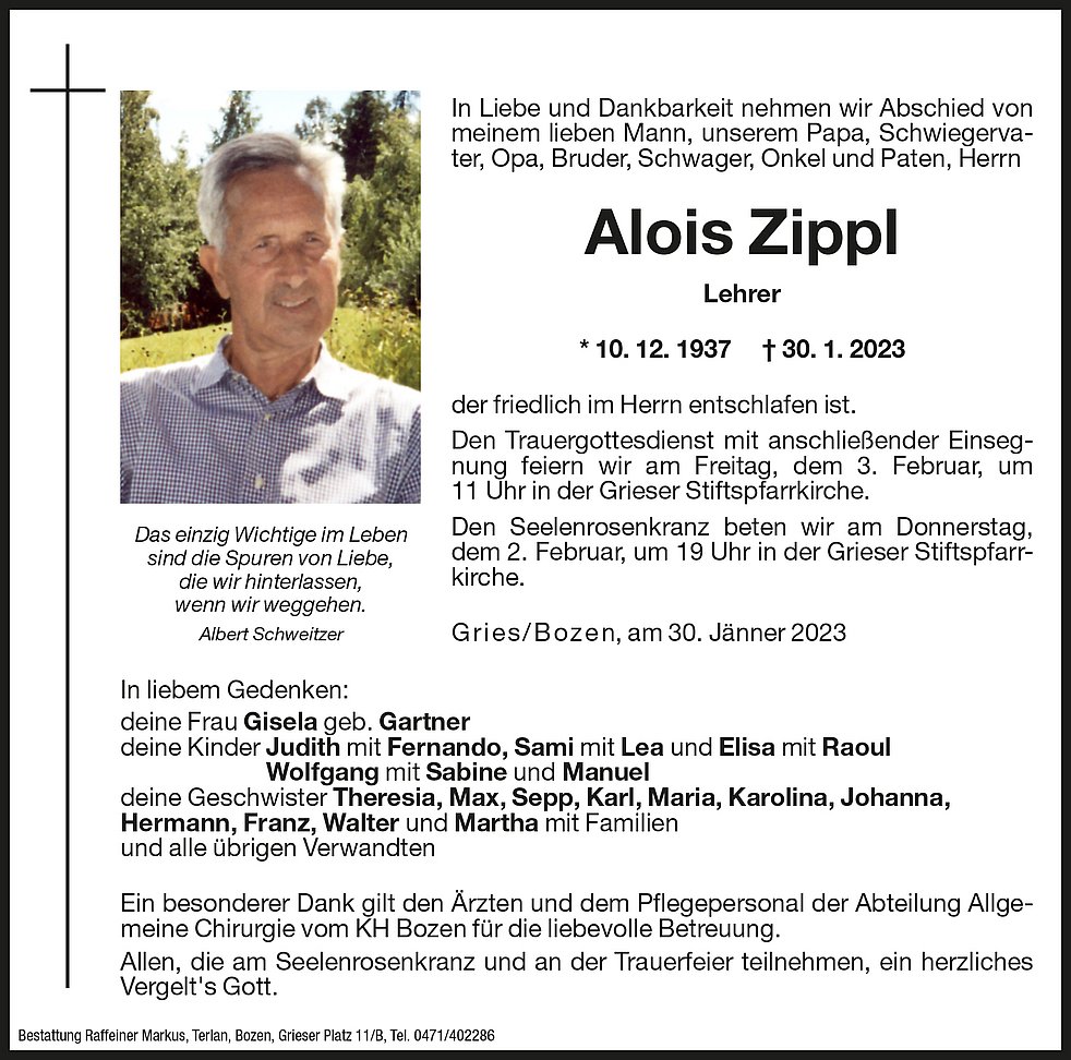 Den Trauergottesdienst mit anschließender Einsegnung feiern wir am Freitag, dem 3. Februar, um 11 Uhr in der Grieser Stiftspfarrkirche.