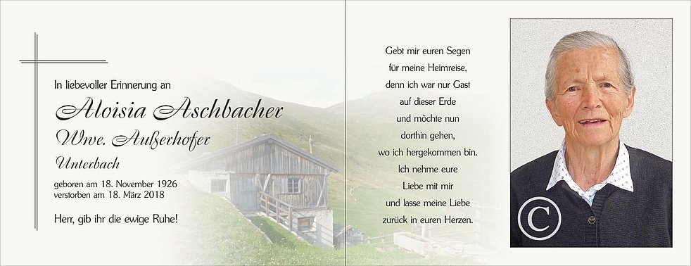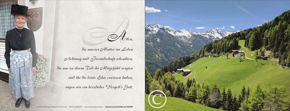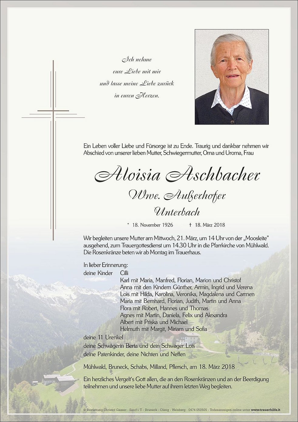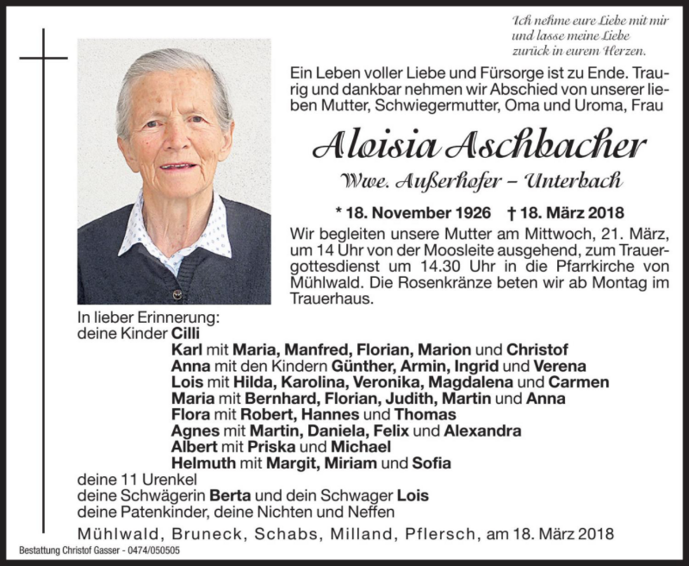 Wir begleiten unsere Mutter am Mittwoch, 21. März, um 14 Uhr von der „Moosleite” ausgehend, zum Trauergottesdienst um 14.30 Uhr in die Pfarrkirche von Mühlwald. Die Rosenkränze beten wir ab Montag im Trauerhaus.