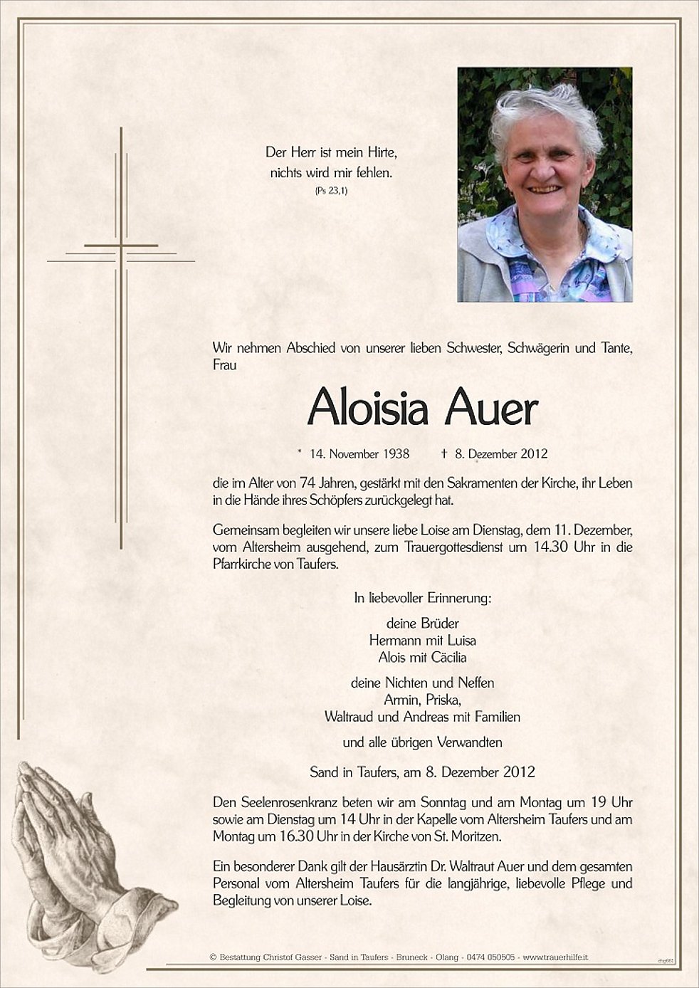 Gemeinsam begleiten wir unsere liebe Loise am Dienstag, dem 11. Dezember, vom Altersheim ausgehend, zum Trauergottesdienst um 14.30 Uhr in die Pfarrkirche von Taufers.
