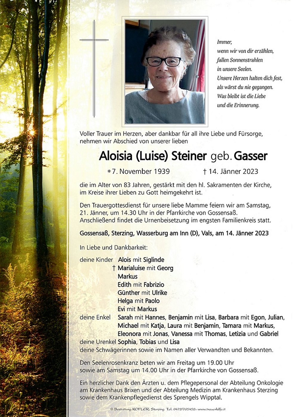 Den Trauergottesdienst für unsere liebe Mamme feiern wir am Samstag, 21. Jänner, um 14.30 Uhr in der Pfarrkirche von Gossensaß. Anschließend findet die Urnenbeisetzung im engsten Familienkreis statt.