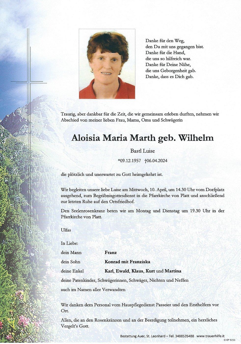 Wir begleiten unsere liebe Luise am Mittwoch, 10. April, um 14.30 Uhr vom Dorfplatz ausgehend, zum Begräbnisgottesdienst in die Pfarrkirche von Platt und anschließend zur letzten Ruhe auf den Ortsfriedhof.