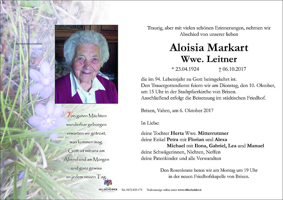 Den Trauergottesdienst feiern wir am Dienstag, den 10. Oktober, um 15 Uhr in der Stadtpfarrkirche von Brixen.