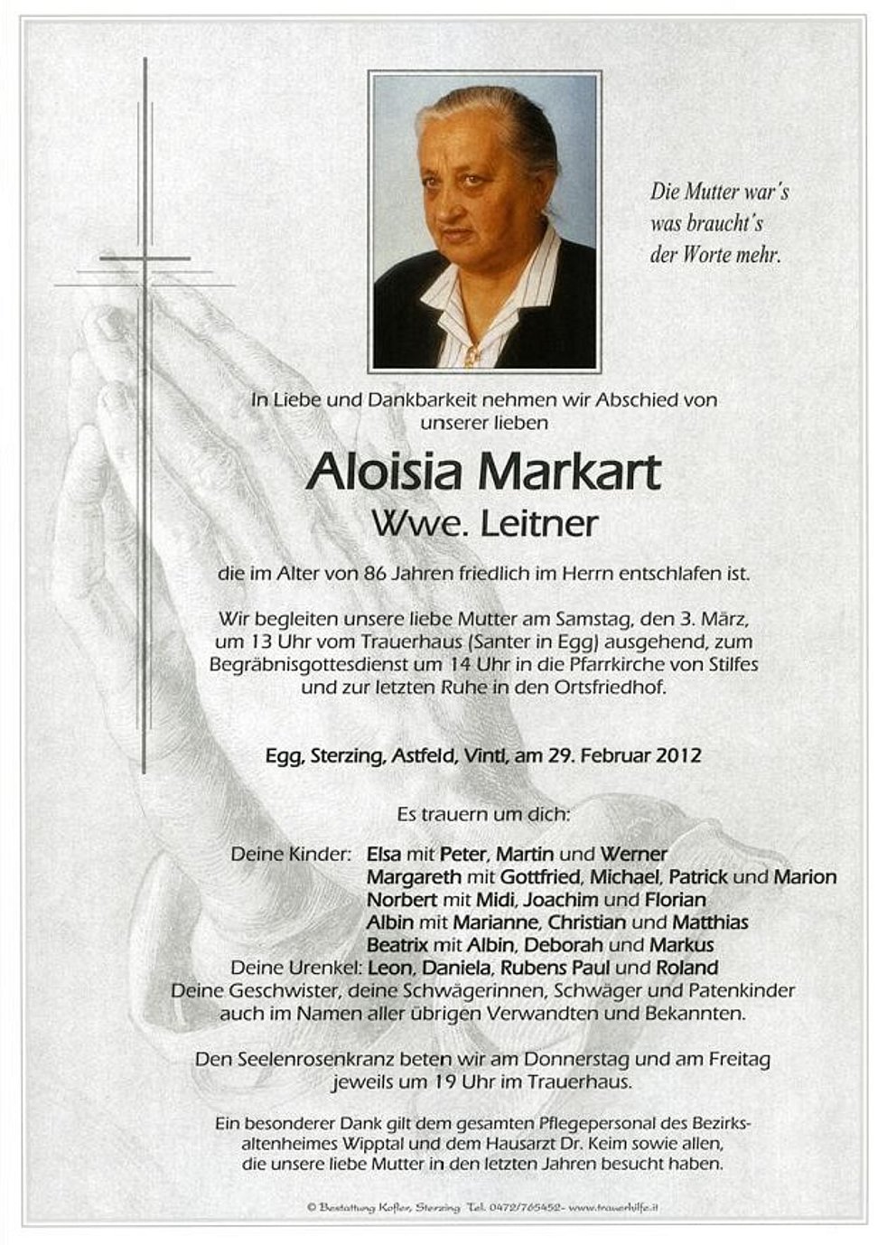 Ein besonderer Dank gilt dem gesamten Pflegepersonal des Bezirksaltenheimes Wipptal und dem Hausarzt Dr. Keim sowie allen, die unsere liebe Mutter in den letzten Jahren besucht haben.