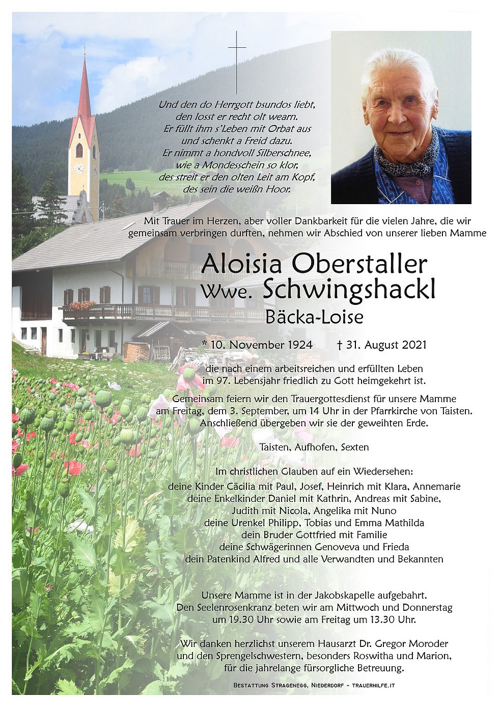 Gemeinsam feiern wir den Trauergottesdienst für unsere Mamme am Freitag, dem 3. September, um 14 Uhr in der Pfarrkirche von Taisten. Anschließend übergeben wir sie der geweihten Erde.