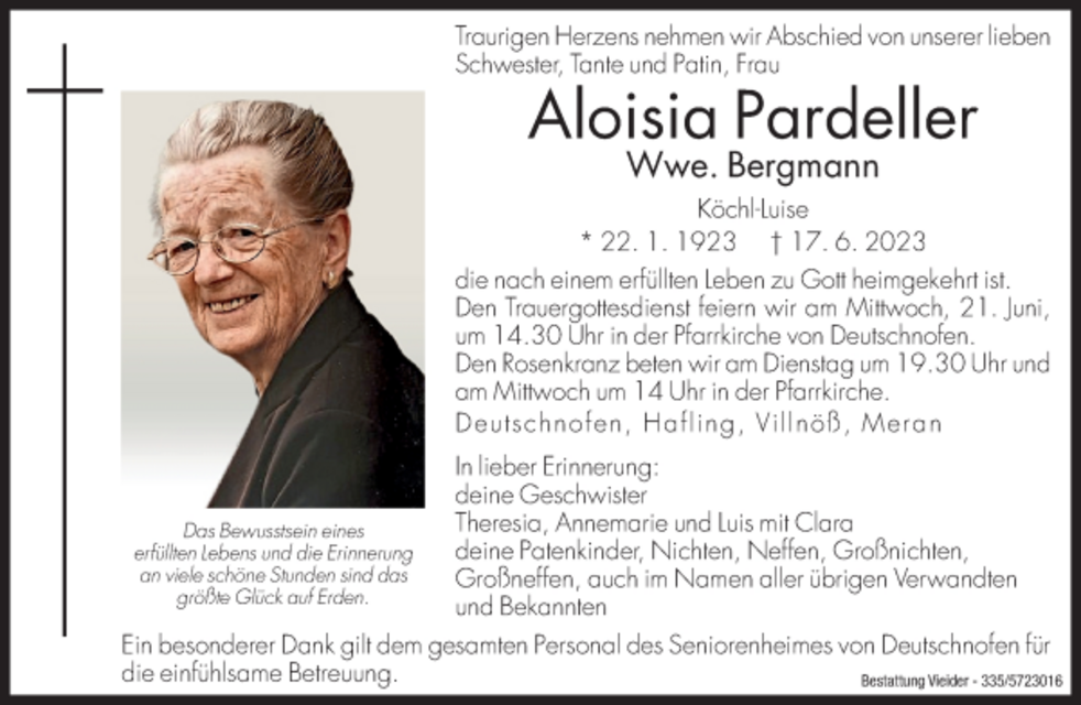 Den Trauergottesdienst feiern wir am Mittwoch, dem 21. Juni, um 14.30 Uhr in der Pfarrkirche von Deutschnofen.