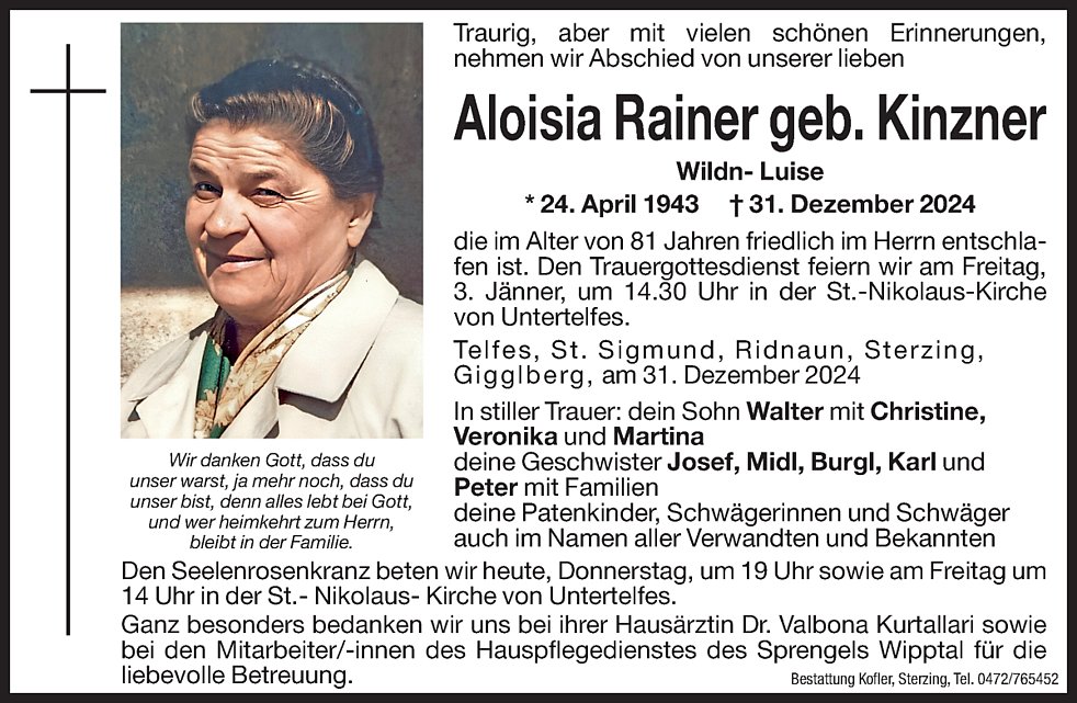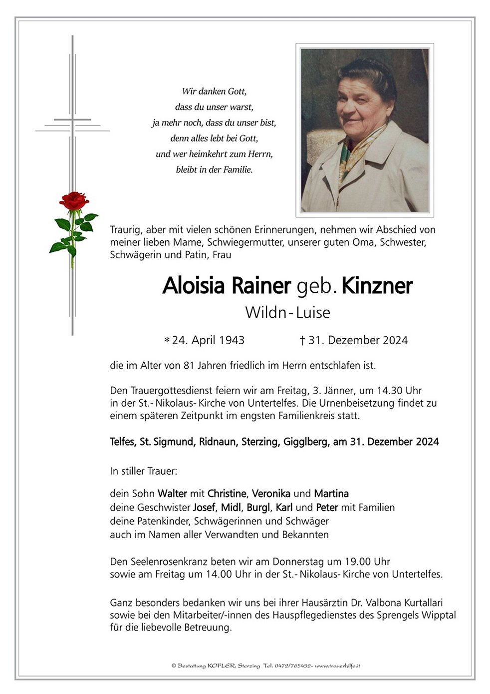 Den Trauergottesdienst feiern wir am Freitag, 3. Jänner, um 14.30 Uhr in der St.- Nikolaus- Kirche von Untertelfes. Die Urnenbeisetzung findet zu einem späteren Zeitpunkt im engsten Familienkreis statt.