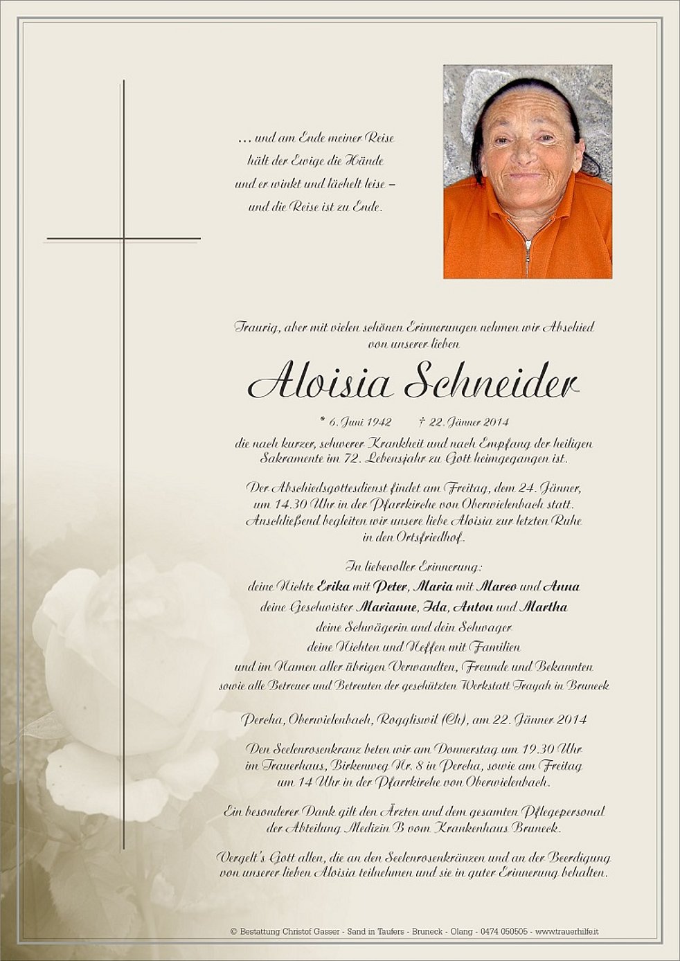 Vergelt’s Gott allen, die an den Seelenrosenkränzen und an der Beerdigung von unserer lieben Aloisia teilnehmen und sie in guter Erinnerung behalten.