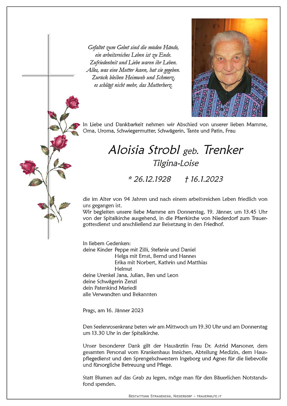 Wir begleiten unsere liebe Mamme am Donnerstag, 19. Jänner, um 13.45 Uhr von der Spitalkirche ausgehend, in die Pfarrkirche von Niederdorf zum Trauergottesdienst und anschließend zur Beisetzung in den Friedhof.