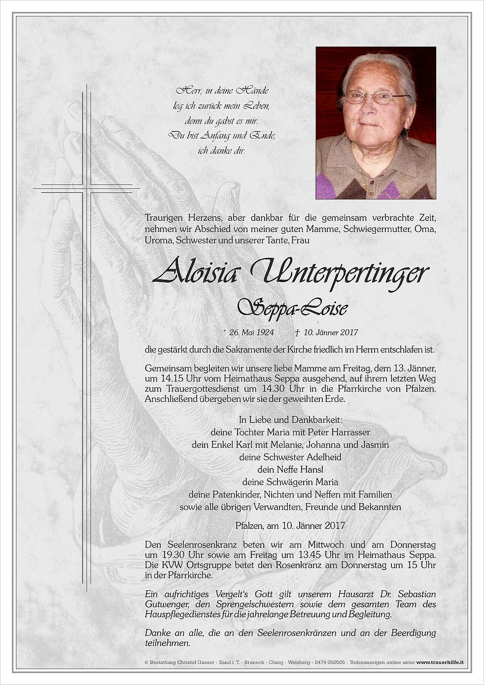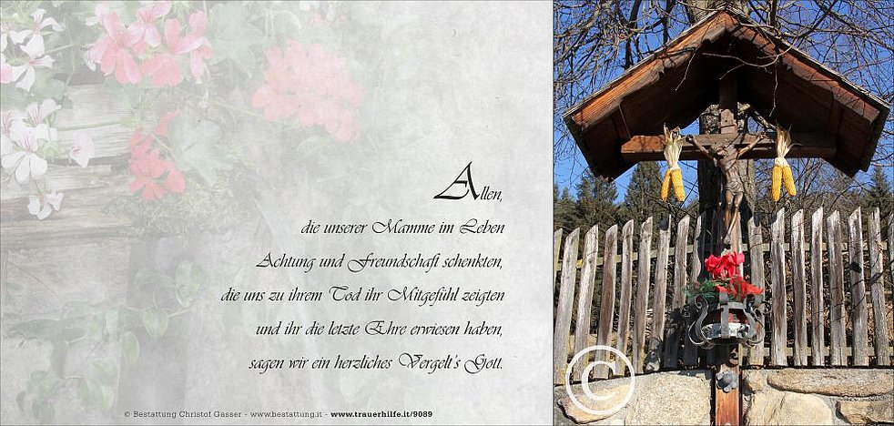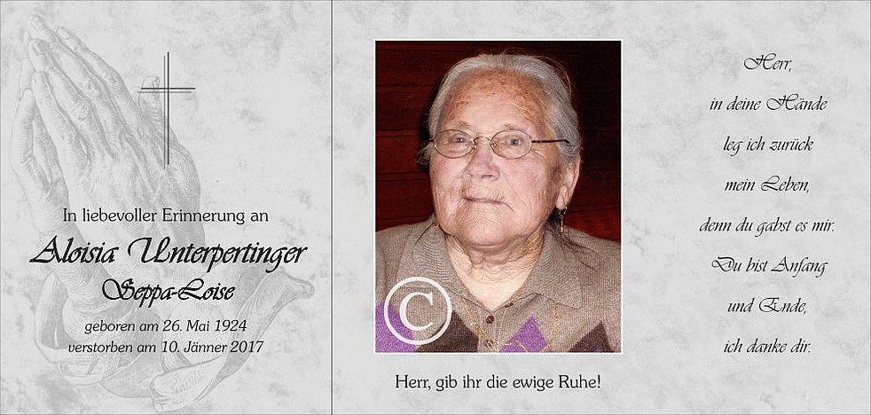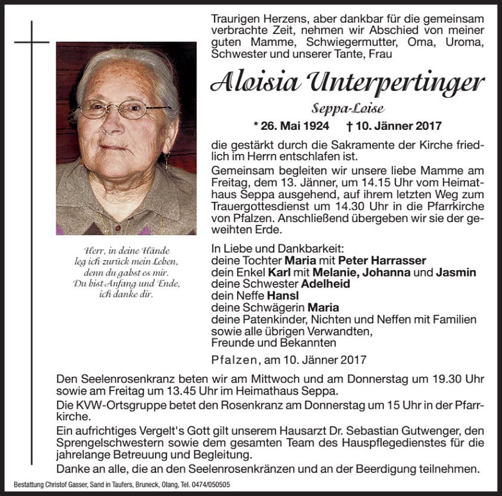 Gemeinsam begleiten wir unsere liebe Mamme am Freitag, dem 13. Jänner, um 14.15 Uhr vom Heimathaus Seppa ausgehend, auf ihrem letzten Weg zum Trauergottesdienst um 14.30 Uhr in die Pfarrkirche von Pfalzen. Anschließend übergeben wir sie der geweihten Erde.