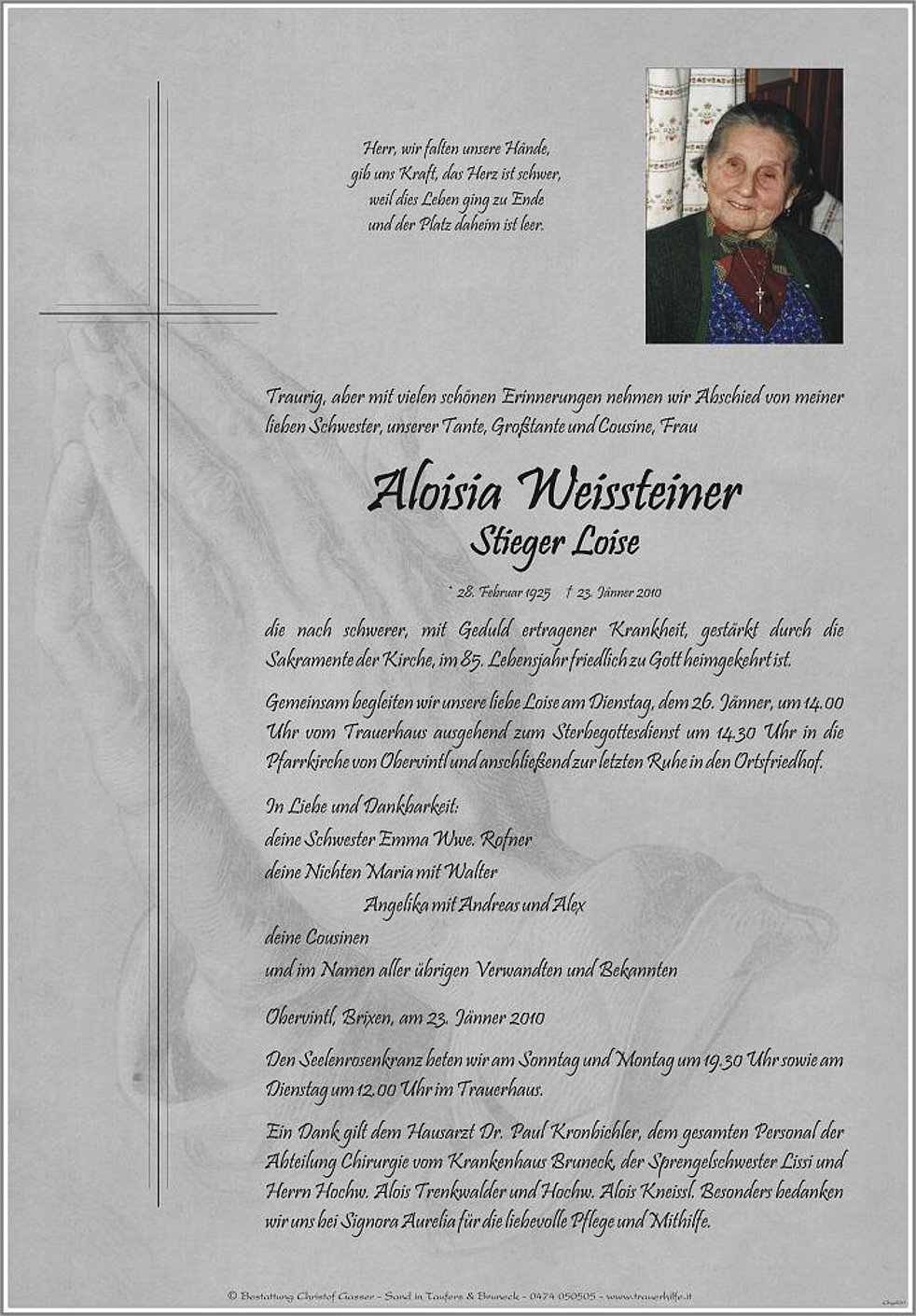 Gemeinsam begleiten wir unsere liebe Loise am Dienstag, dem 26. Jänner, um 14.00 Uhr vom Trauerhaus ausgehend zum Sterbegottesdienst um 14.30 Uhr in die Pfarrkirche von Obervintl und anschließend zur letzten Ruhe in den Ortsfriedhof.