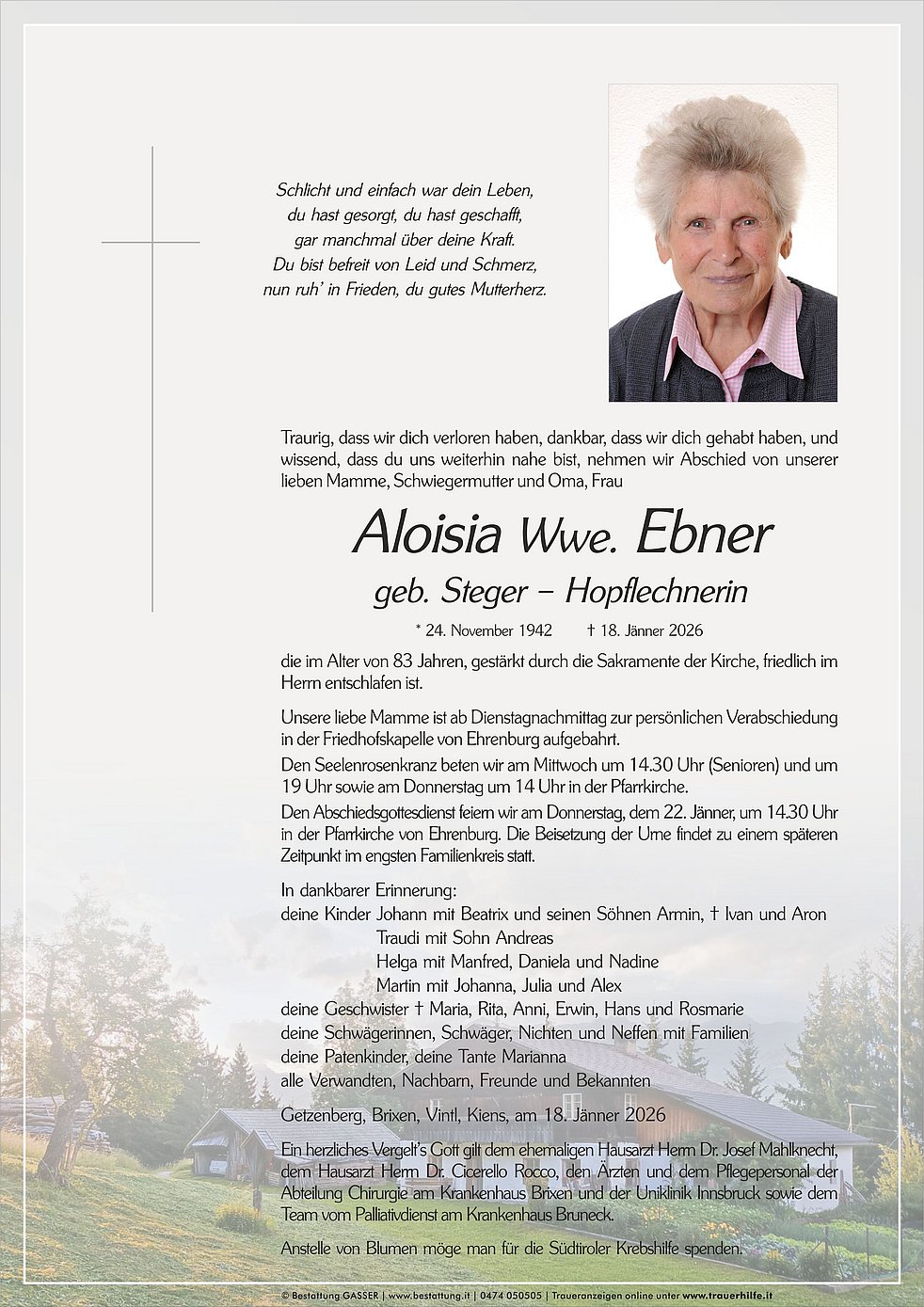Anstelle von Blumen möge man für die Südtiroler Krebshilfe spenden.