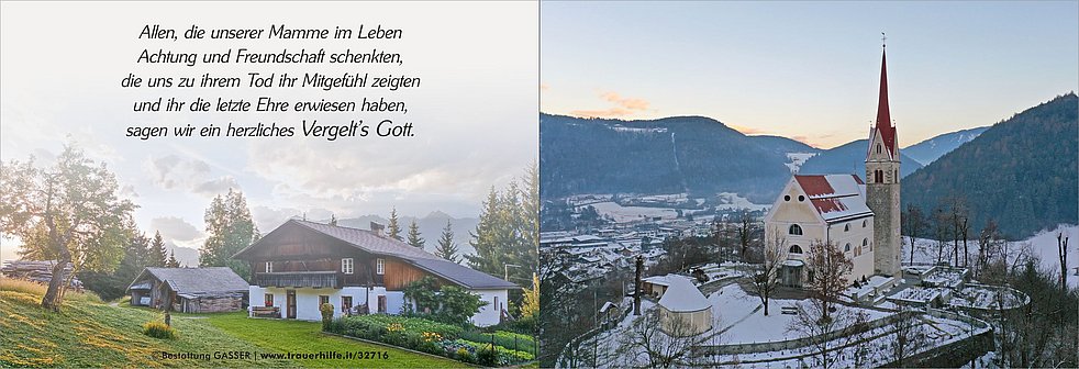Ein herzliches Vergelt’s Gott gilt dem ehemaligen Hausarzt Herrn Dr. Josef Mahlknecht, dem Hausarzt Herrn Dr. Cicerello Rocco, den Ärzten und dem Pflegepersonal der Abteilung Chirurgie am Krankenhaus Brixen und der Uniklinik Innsbruck sowie dem Team vom Palliativdienst am Krankenhaus Bruneck.