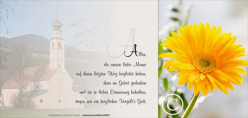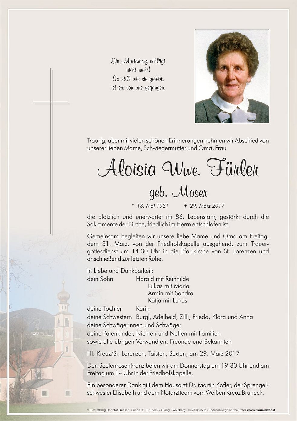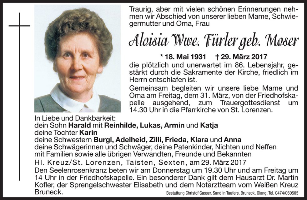 Gemeinsam begleiten wir unsere liebe Mame und Oma am Freitag, dem 31. März, von der Friedhofskapelle ausgehend, zum Trauergottesdienst um 14.30 Uhr in die Pfarrkirche von St. Lorenzen und anschließend zur letzten Ruhe.