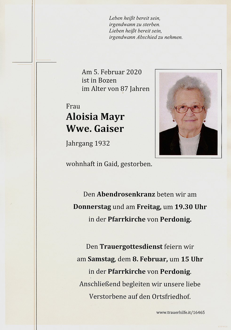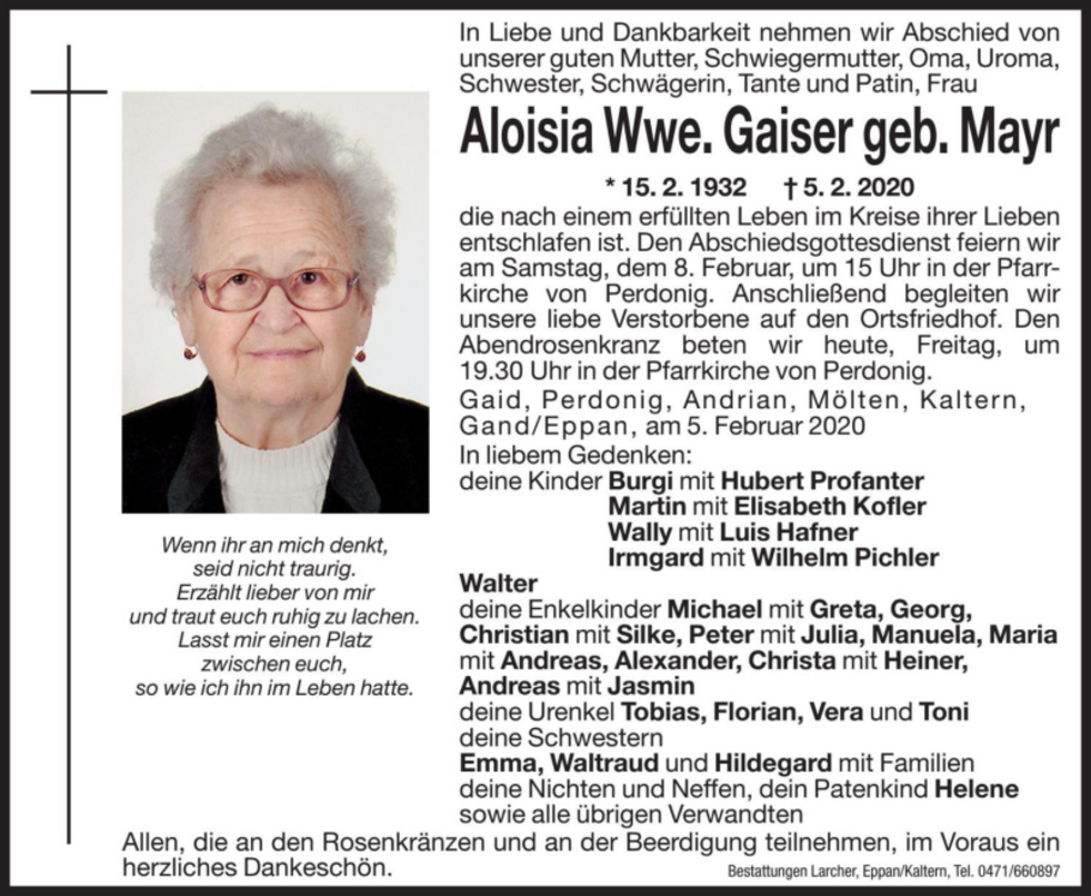 Den Abschiedsgottesdienst feiern wir am Samstag, dem 8. Februar um 15 Uhr in der Pfarrkirche von Perdonig. Anschließend begleiten wir unsere liebe Verstorbene auf den Ortsfriedhof.