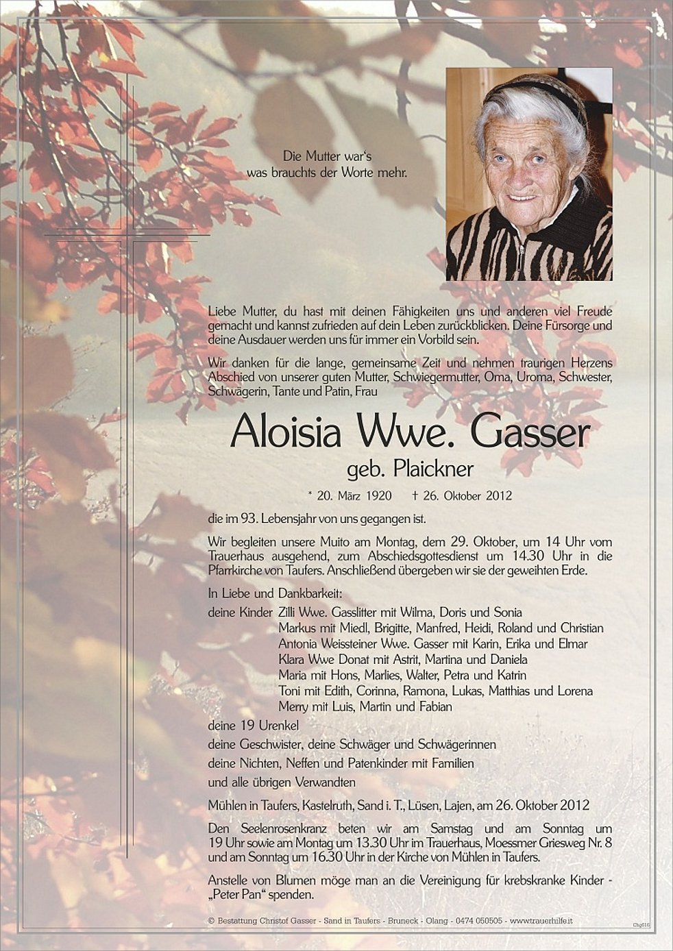 Wir begleiten unsere Muito am Montag, dem 29. Oktober, um 14 Uhr vom Trauerhaus ausgehend, zum Abschiedsgottesdienst um 14.30 Uhr in die Pfarrkirche von Taufers. Anschließend übergeben wir sie der geweihten Erde.