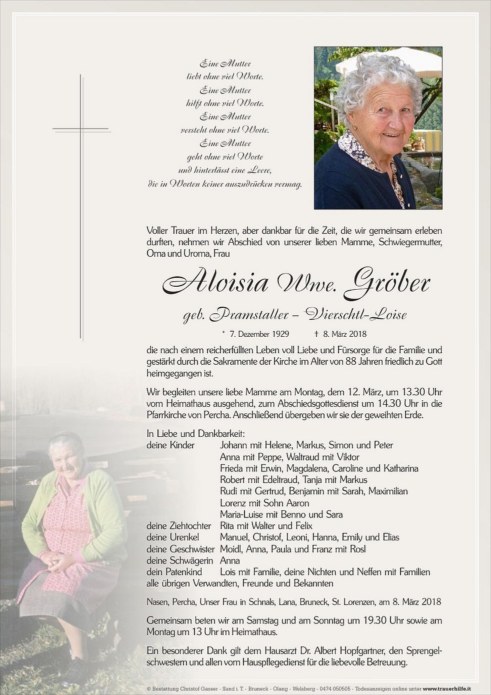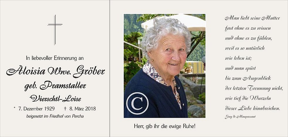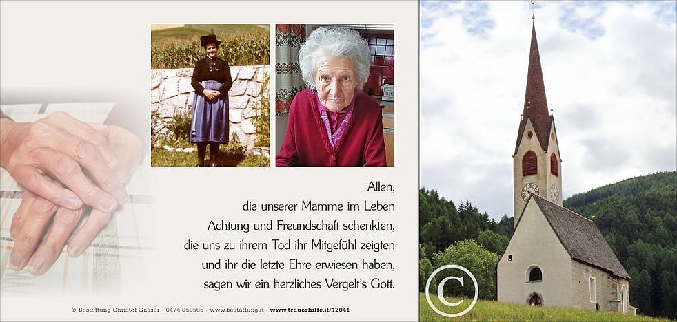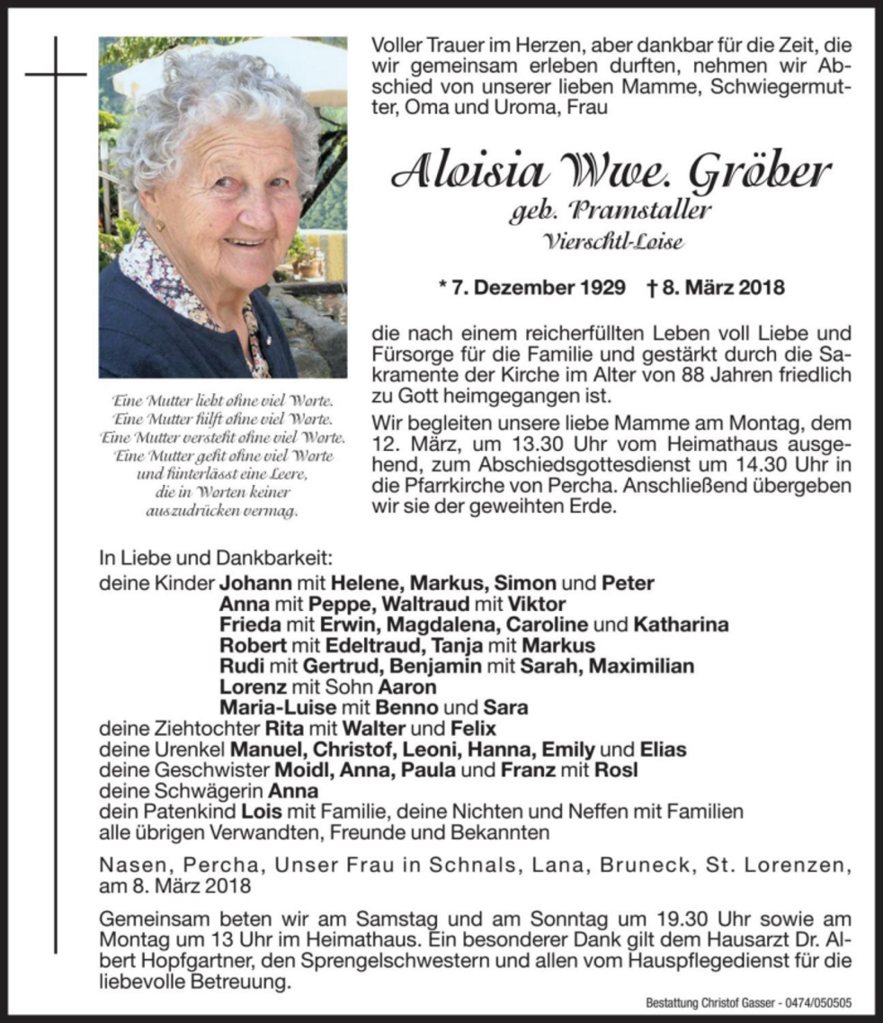 Wir begleiten unsere liebe Mamme am Montag, dem 12. März, um 13.30 Uhr vom Heimathaus ausgehend, zum Abschiedsgottesdienst um 14.30 Uhr in die Pfarrkirche von Percha. Anschließend übergeben wir sie der geweihten Erde.