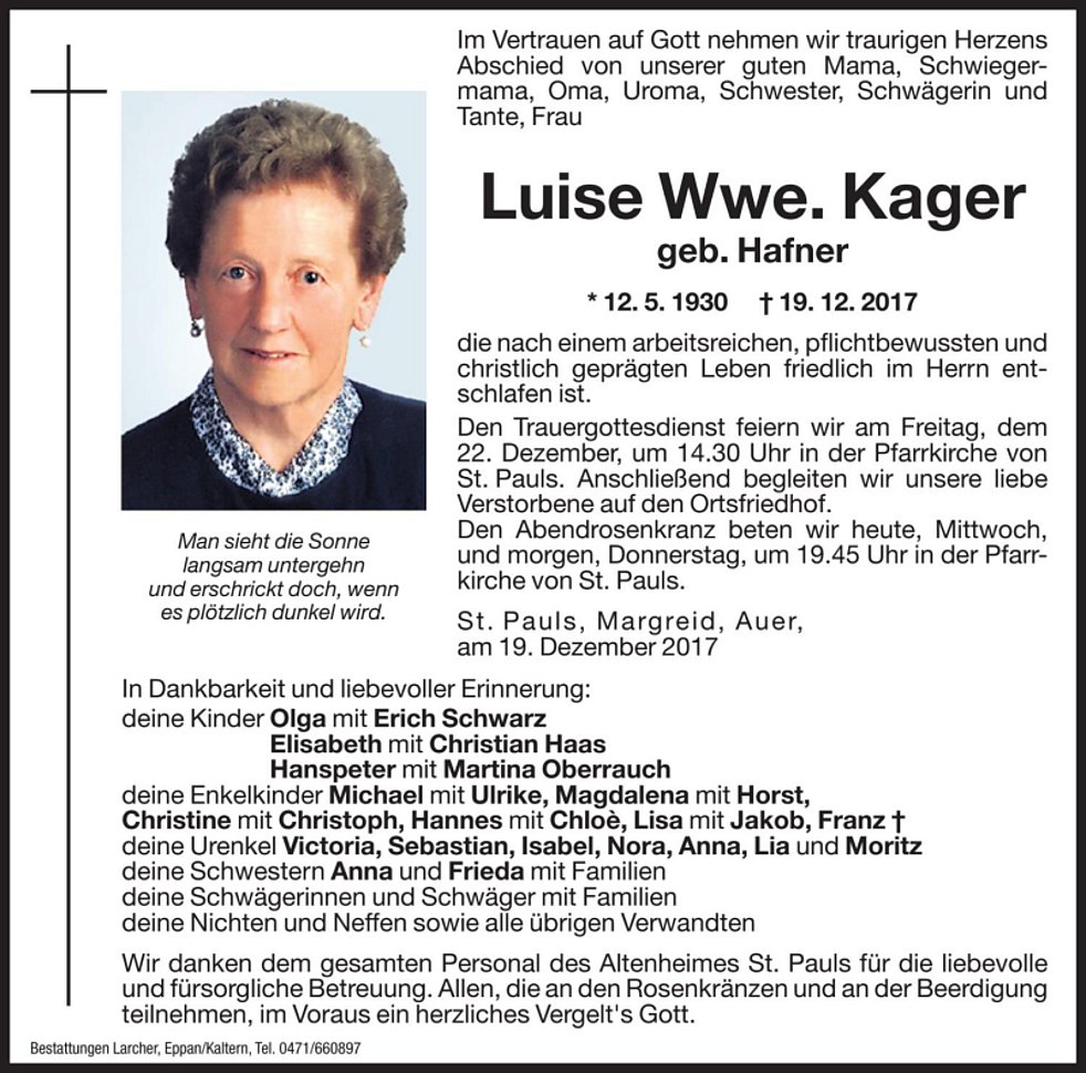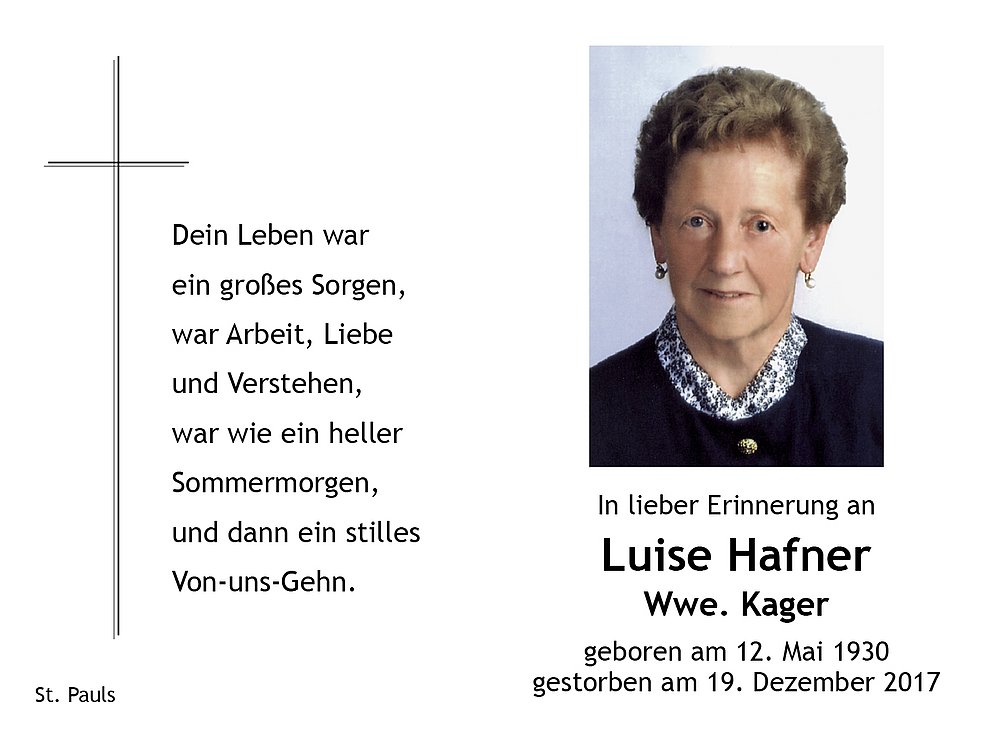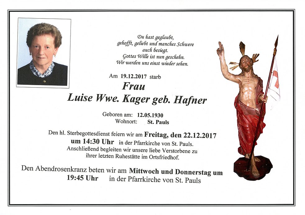 Den Trauergottesdienst feiern wir am Freitag, dem 22. Dezember um 14.30 Uhr in der Pfarrkirche von St. Pauls. Anschließend begleiten wir unsere liebe Verstorbene auf den Ortsfriedhof.