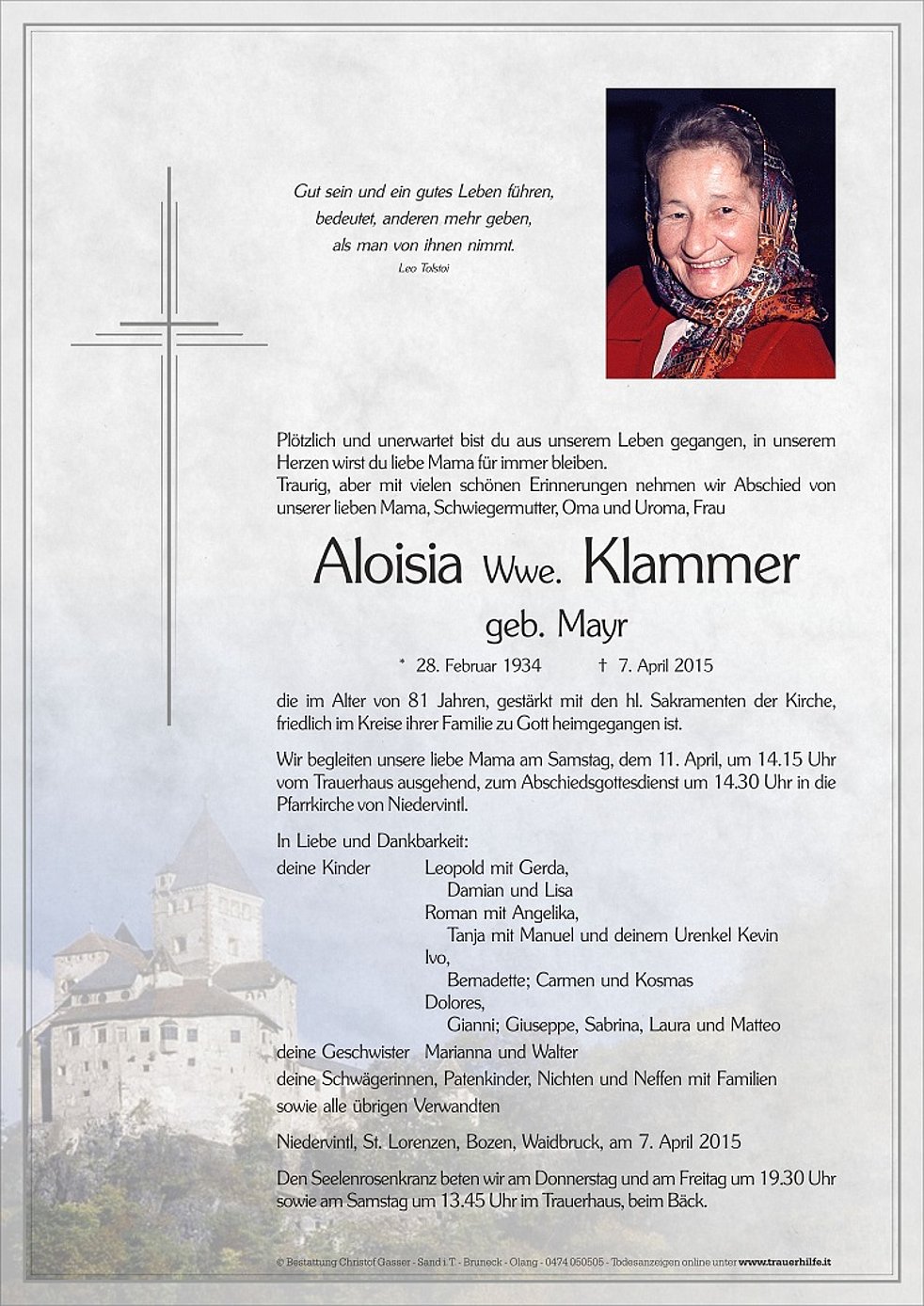 Wir begleiten unsere liebe Mama am Samstag, dem 11. April, um 14.15 Uhr vom Trauerhaus ausgehend, zum Abschiedsgottesdienst um 14.30 Uhr in die Pfarrkirche von Niedervintl.