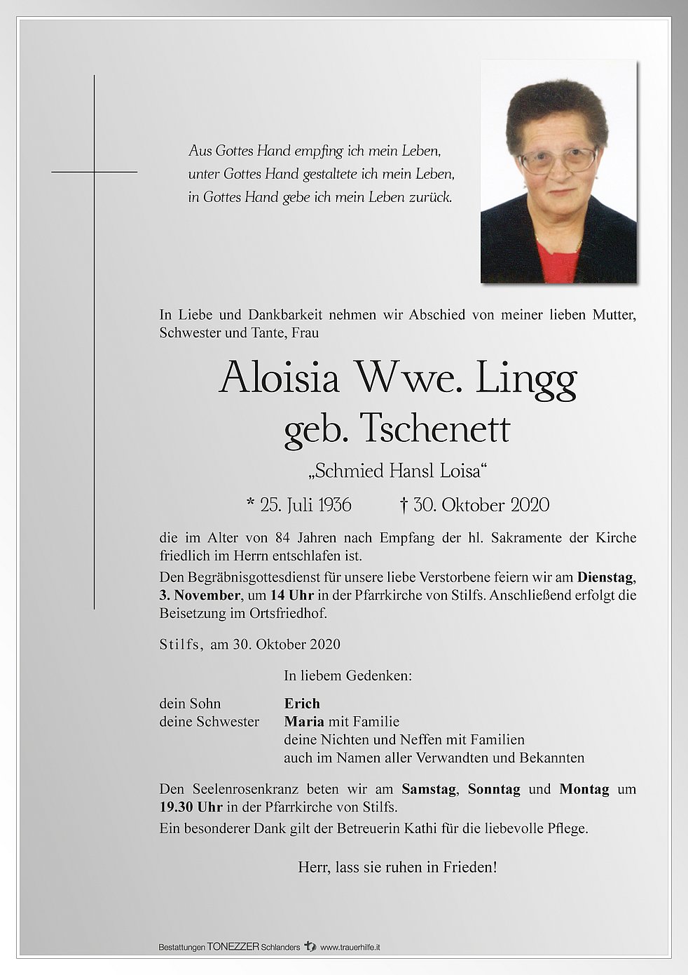 Den Begräbnisgottesdienst für unsere liebe Verstorbene feiern wir am Dienstag, 3. November, um 14 Uhr in der Pfarrkirche von Stilfs.