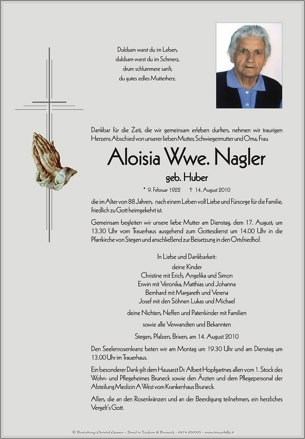 Gemeinsam begleiten wir unsere liebe Mutter am Dienstag, dem 17. August, um 13.30 Uhr vom Trauerhaus ausgehend zum Gottesdienst um 14.00 Uhr in die Pfarrkirche von Stegen und anschließend zur Beisetzung in den Ortsfriedhof.