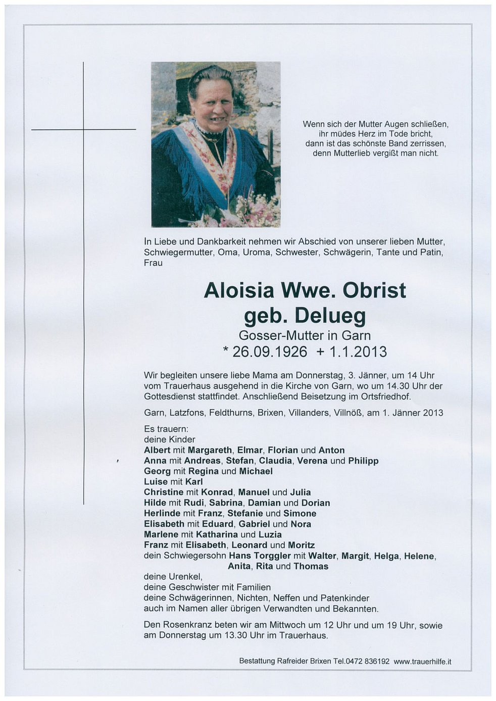 Ein besonderen Dank gilt dem Hausarzt Dr. Klaus Rabensteiner, dem Hauspflege- und Krankenpflegedienst Sprengel Klausen für die liebevolle Betreuung, Hochw. Silvester Aschbacher für den geistlichen Beistand und allen, die an den Rosenkränzen und an der Beerdigung teilnehmen.