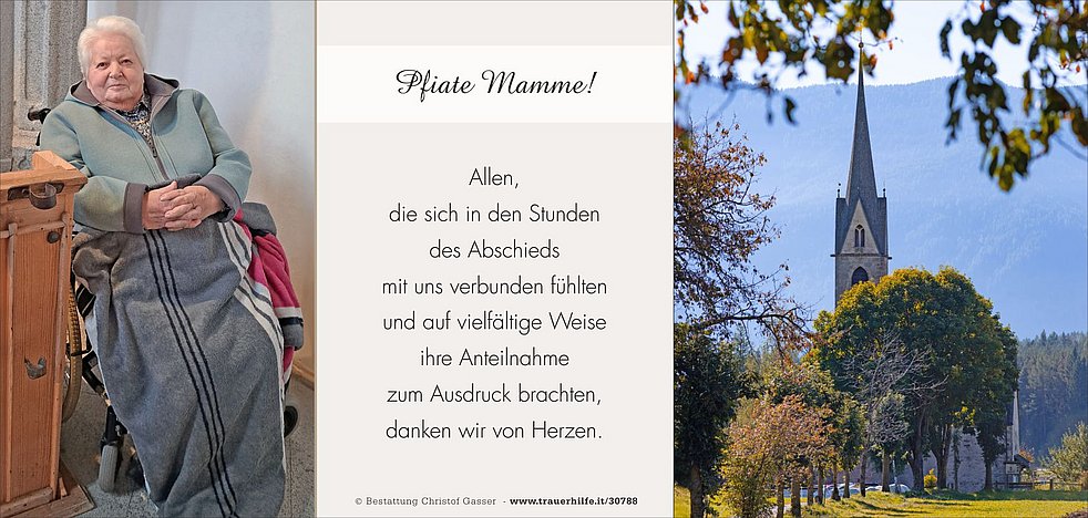 Ein herzliches Vergelt’s Gott an Enkelin Marion und Pflegerin Carmen, dem Hausarzt Dr. Paul Gufler, dem Sanitäts- und Sozialsprengel Bruneck sowie dem Team der Abteilung Palliativ am Krankenhaus Bruneck für die Pflege unserer Mamme.