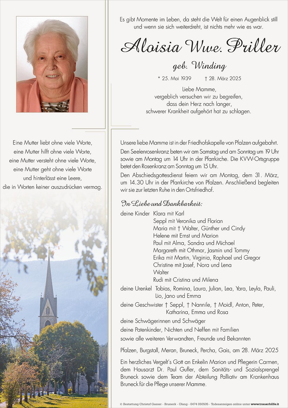 Den Abschiedsgottesdienst feiern wir am Montag, dem 31. März, um 14.30 Uhr in der Pfarrkirche von Pfalzen. Anschließend begleiten wir sie zur letzten Ruhe in den Ortsfriedhof.