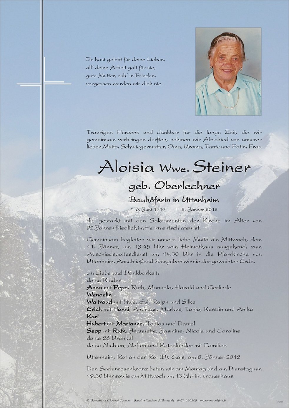 11. Jänner, um 13.45 Uhr vom Heimathaus ausgehend, zum Abschiedsgottesdienst um 14.30 Uhr in die Pfarrkirche von Uttenheim. Anschließend übergeben wir sie der geweihten Erde.