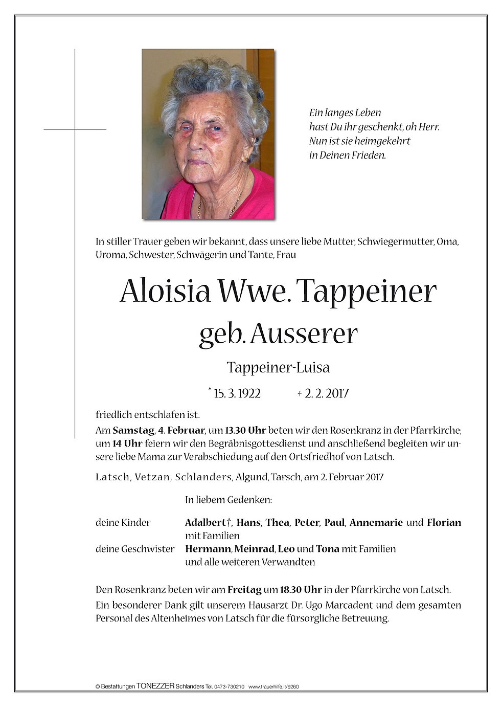 friedlich entschlafen ist. Am Samstag, 4. Februar, um 13.30 Uhr beten wir den Rosenkranz in der Pfarrkirche; um 14 Uhr feiern wir den Begräbnisgottesdienst und anschließend begleiten wir unsere liebe Mama zur Verabschiedung auf den Ortsfriedhof von Latsch.