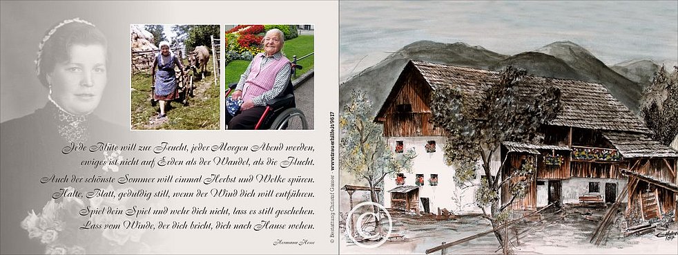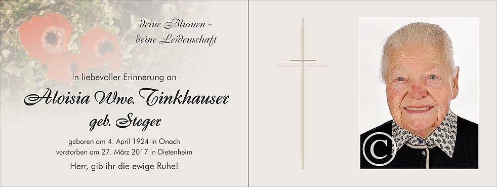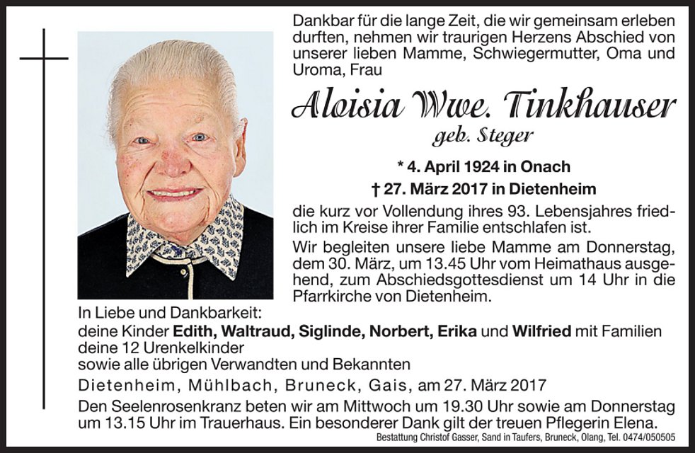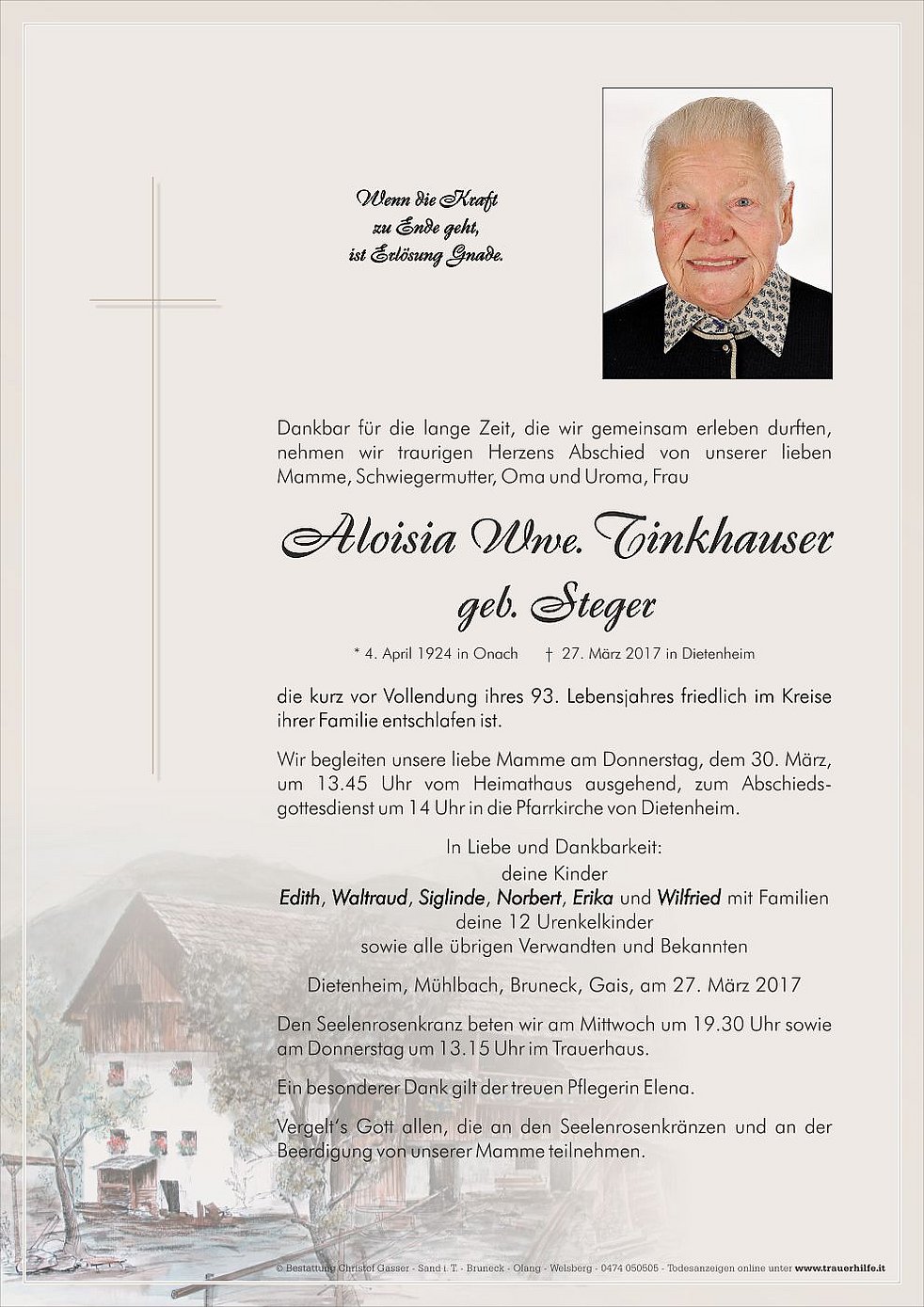 Wir begleiten unsere liebe Mamme am Donnerstag, dem 30. März, um 13.45 Uhr vom Heimathaus ausgehend, zum Abschiedsgottesdienst um 14 Uhr in die Pfarrkirche von Dietenheim.