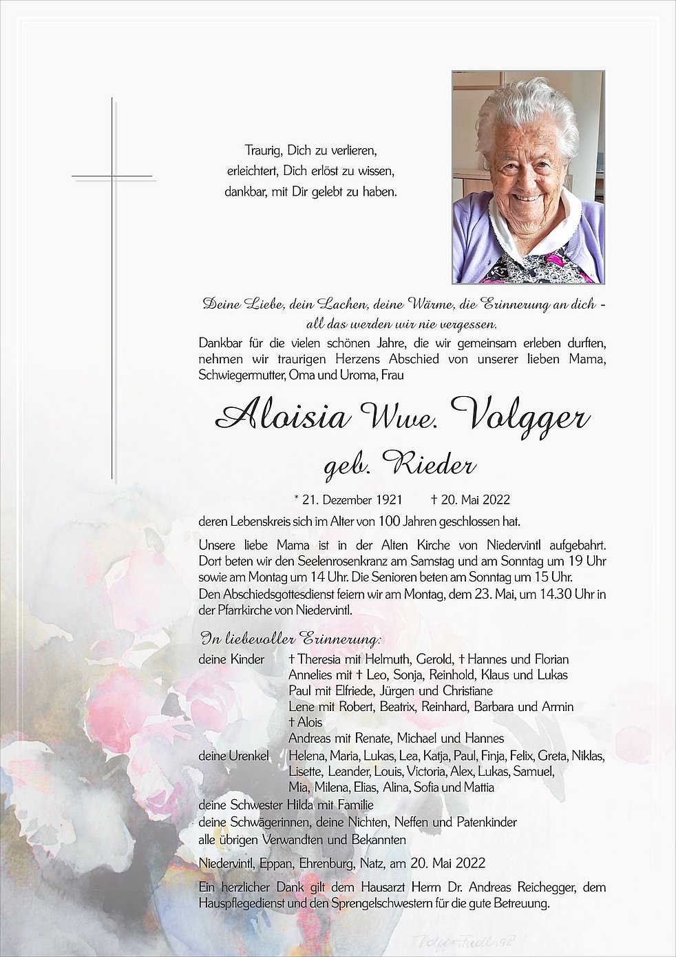 Ein herzlicher Dank gilt dem Hausarzt Herrn Dr. Andreas Reichegger, dem Hauspflegedienst und den Sprengelschwestern für die gute Betreuung.