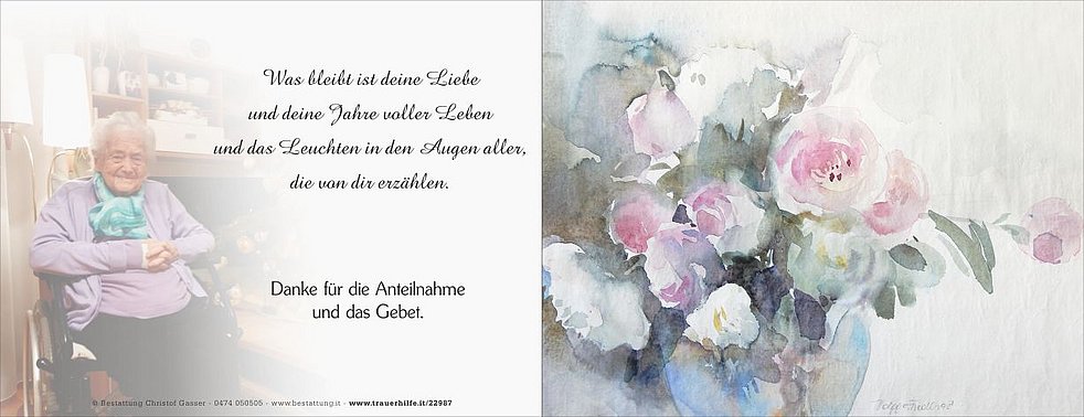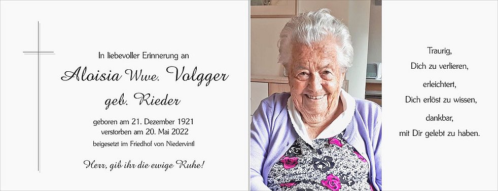 Dankbar für die vielen schönen Jahre, die wir gemeinsam erleben durften, nehmen wir traurigen Herzens Abschied von unserer lieben Mama, Schwiegermutter, Oma und Uroma, Frau
