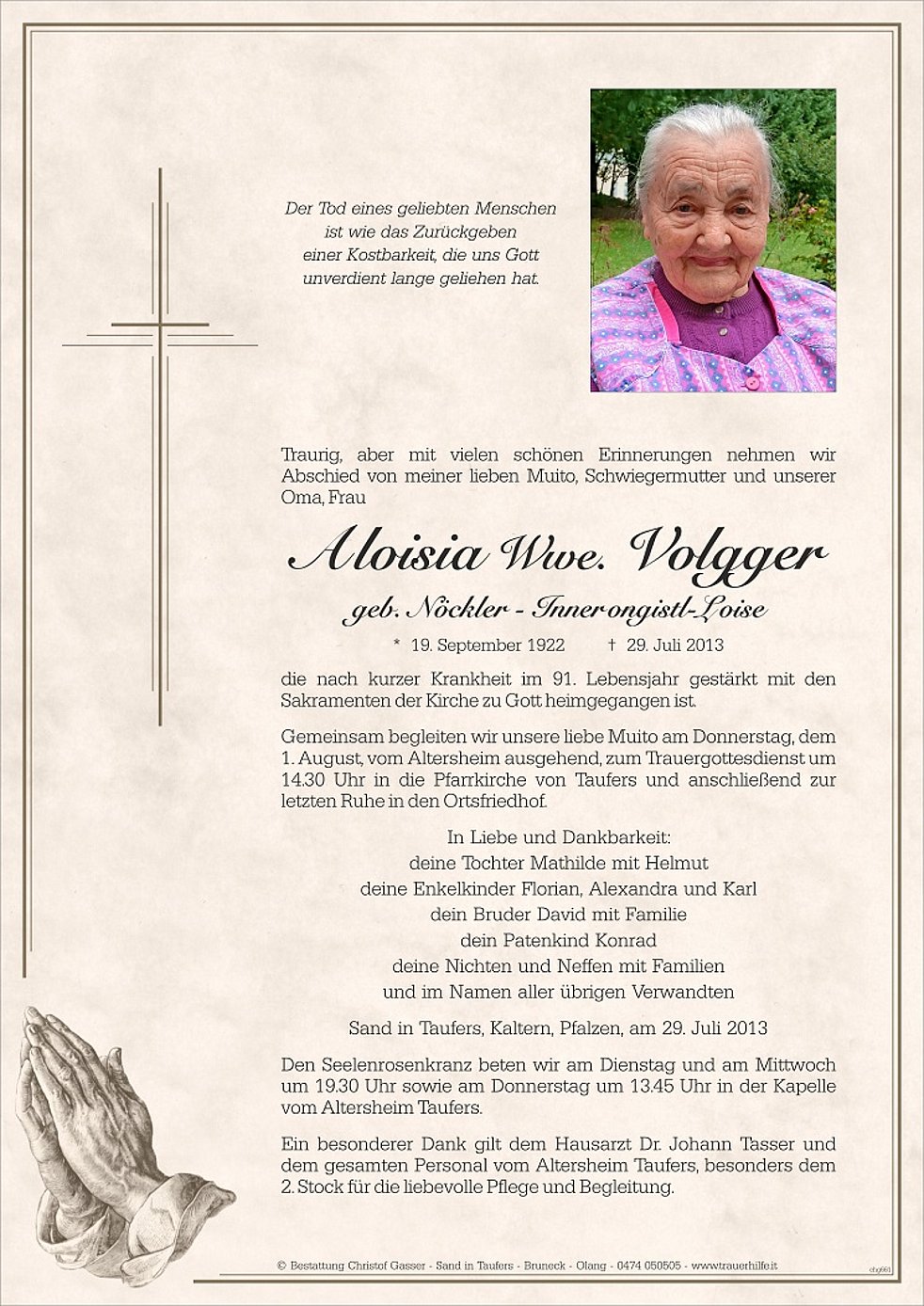 Gemeinsam begleiten wir unsere liebe Muito am Donnerstag, dem 1. August, vom Altersheim ausgehend, zum Trauergottesdienst um 14.30 Uhr in die Pfarrkirche von Taufers und anschließend zur letzten Ruhe in den Ortsfriedhof.