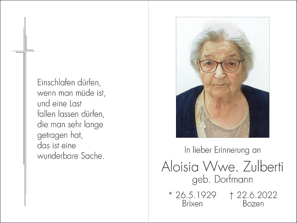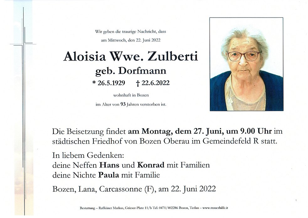 Die Beisetzung findet am Montag, dem 27. Juni, um 9.00 Uhr im städtischen Friedhof von Bozen Oberau im Gemeindefeld R statt.