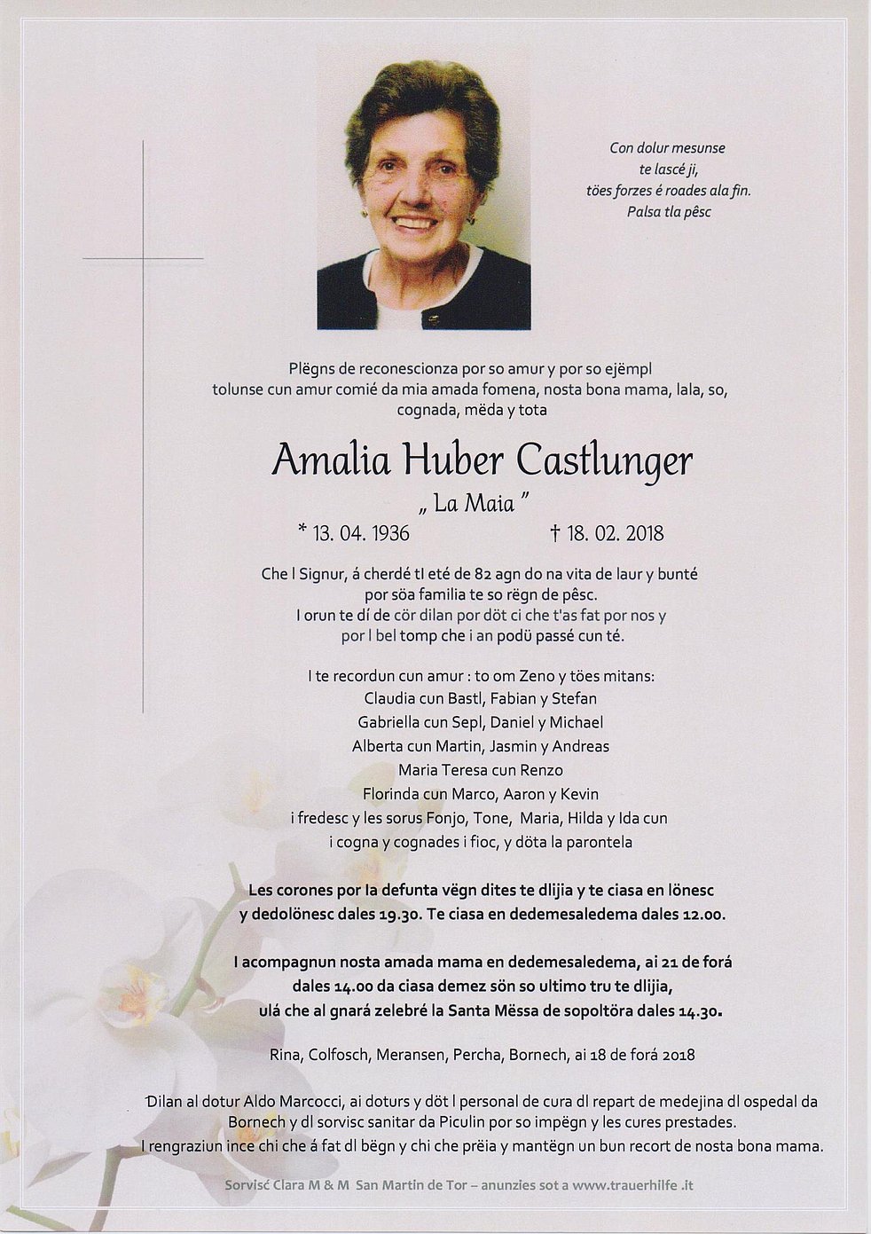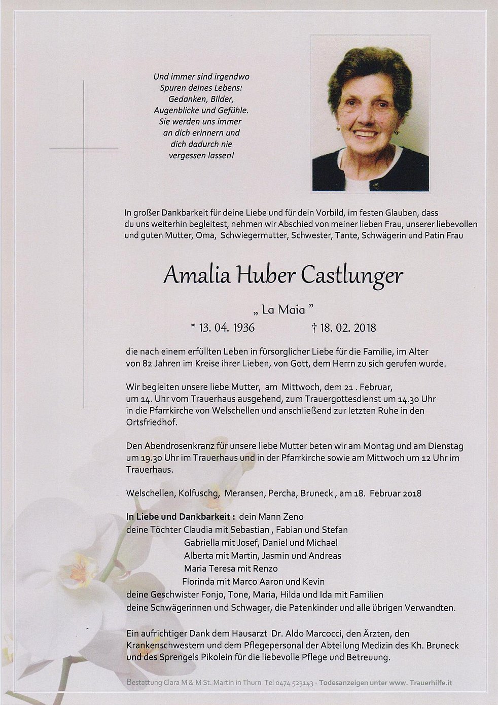 Ein aufrichtiger Dank dem Hausarzt Dr. Aldo Marcocci, den Ärzten, den Krankenschwestern und dem Pflegepersonal der Abteilung Medizin des Krankenhauses Bruneck und des Sprengels Pikolein für die liebevolle Pflege und Betreuung.