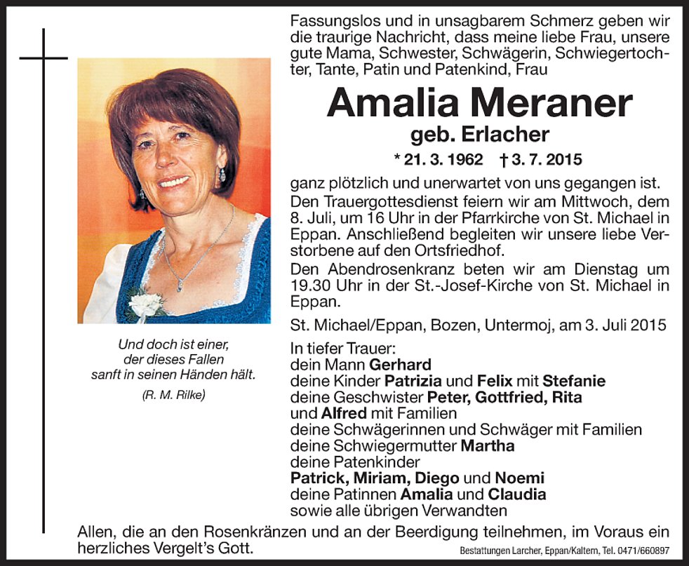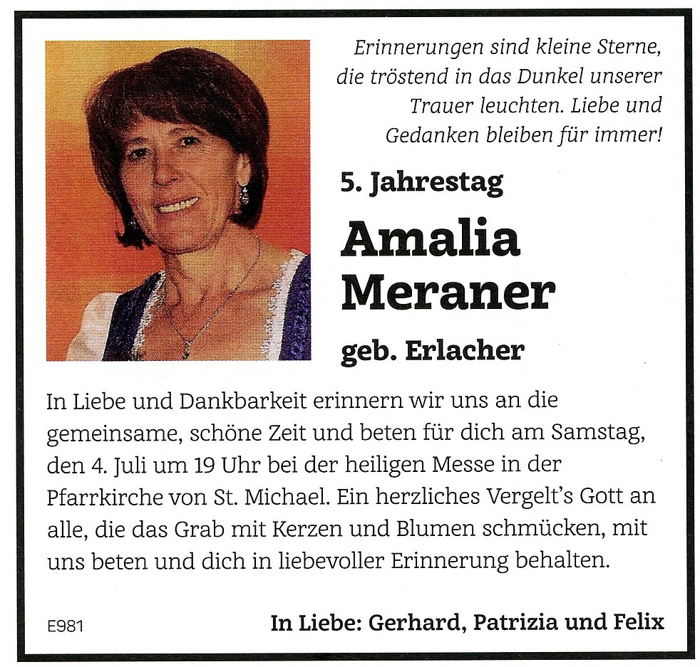 Den Trauergottesdienst feiern wir am Mittwoch, den 8. Juli um 16 Uhr in der Pfarrkirche von St. Michael/Eppan. Anschließend begleiten wir unsere liebe Verstorbene auf den Ortsfriedhof.