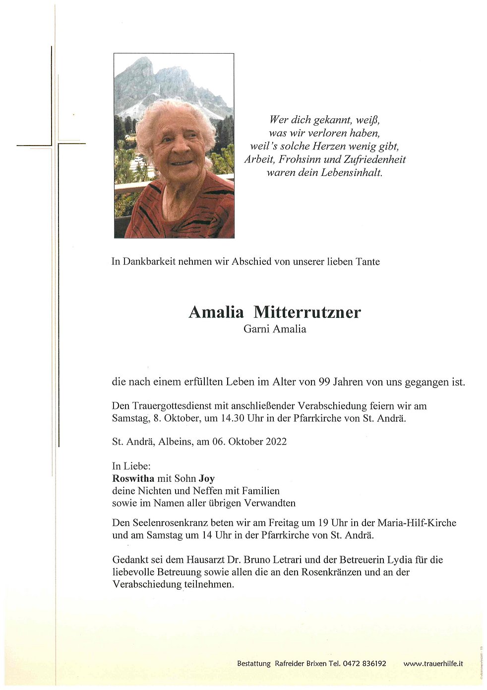 Gedankt sei dem Hausarzt Dr. Bruno Letrari und der Betreuerin Lydia für die liebevolle Betreuung sowie allen die an den Rosenkränzen und an der Verabschiedung teilnehmen.